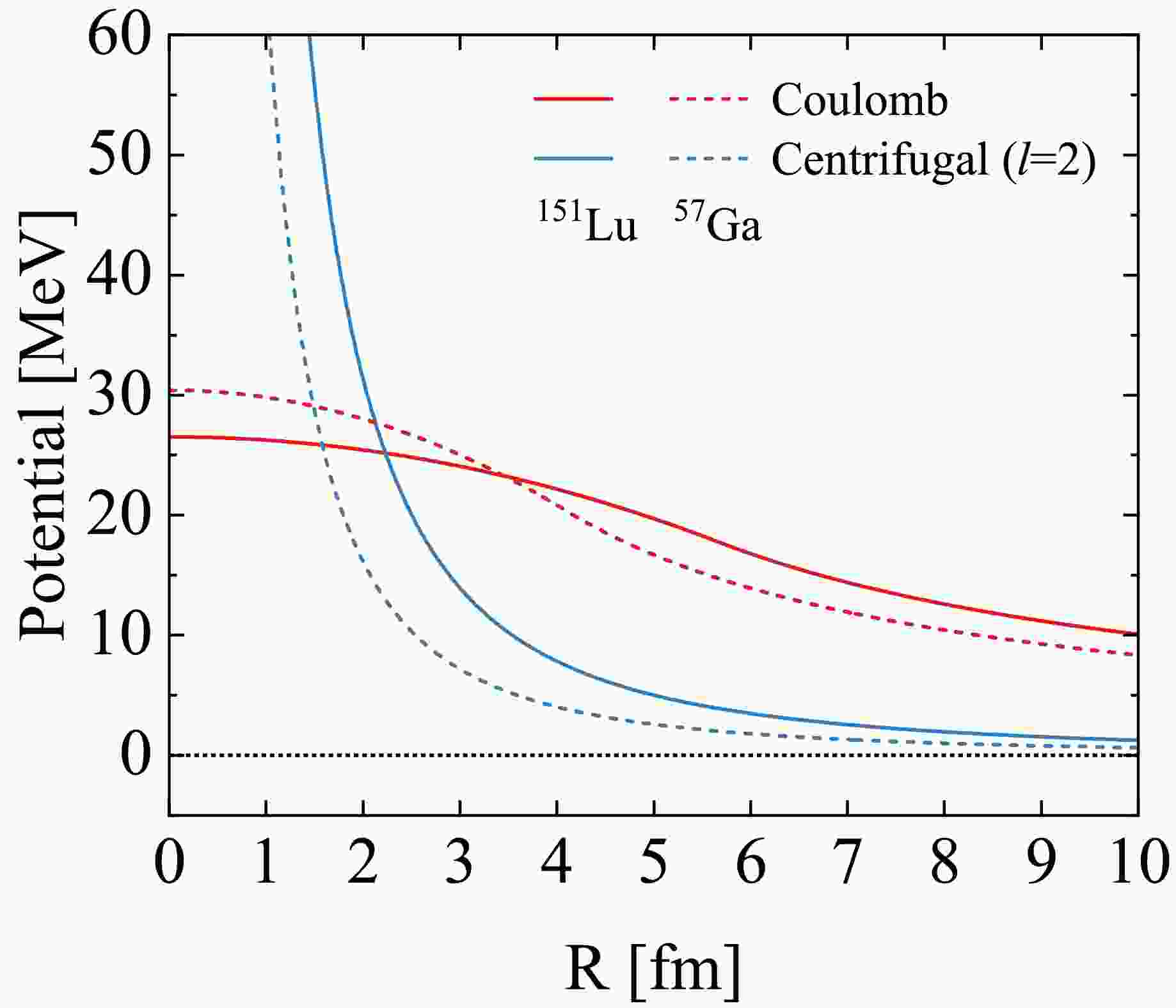 $Z_d^{0.8}+l$ , implicitly assuming similar scaling behavior for the two potentials. In reality, these two components have distinct physical origins and radial dependencies. In Fig. 1, a sketch is given to explicitly demonstrate the difference between the Coulomb and centrifugal potentials by taking one-proton emitter$^{151} \text{Lu} $ and two-proton candidate$^{57} \text{Ga} $ as examples. The Coulomb potential$(\propto 1/R)$ arises from the long-range electrostatic repulsion dependent on the daughter-nucleus charge number$Z_d$ . It varies smoothly with the relative distance R and dominates in the outer tunneling region. In contrast, the centrifugal potential$(\propto 1/R^2)$ is a relatively shorter-range quantum effect dependent on the orbital angular momentum l. It decreases sharply with the relative distance and provides contributions mainly in the inner barrier region. Though there exist differences between these two potentials, above single additive quantity$Z_d^{0.8}+l$ is usually employed to evaluate their common contributions to the decay half-lives within the GN law. Hence, it is of particular interest to separate this additive term to quantify their distinct contributions to the decay half-lives.