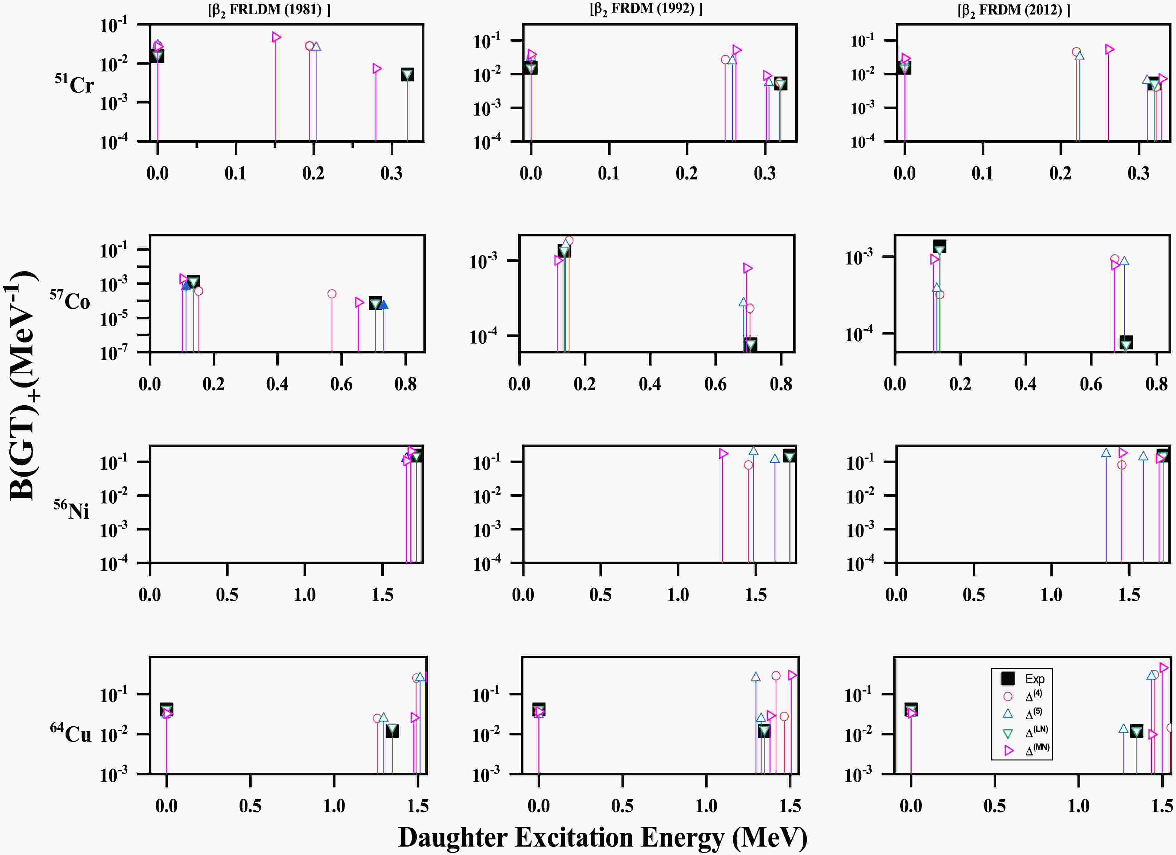 $ \Delta^{(4)} $ ,$ \Delta^{(5)} $ ,$ \Delta^{(\mathrm{LN})} $ , and$ \Delta^{(\mathrm{MN})} $ and three nuclear deformation parameter sets derived from the$ \beta_{2} $ [FRLDM (1981)],$ \beta_{2} $ [FRDM (1992)], and$ \beta_{2} $ [FRDM (2012)].Figure 1 presents the calculated ground-state Gamow–Teller (GT) strength functions for