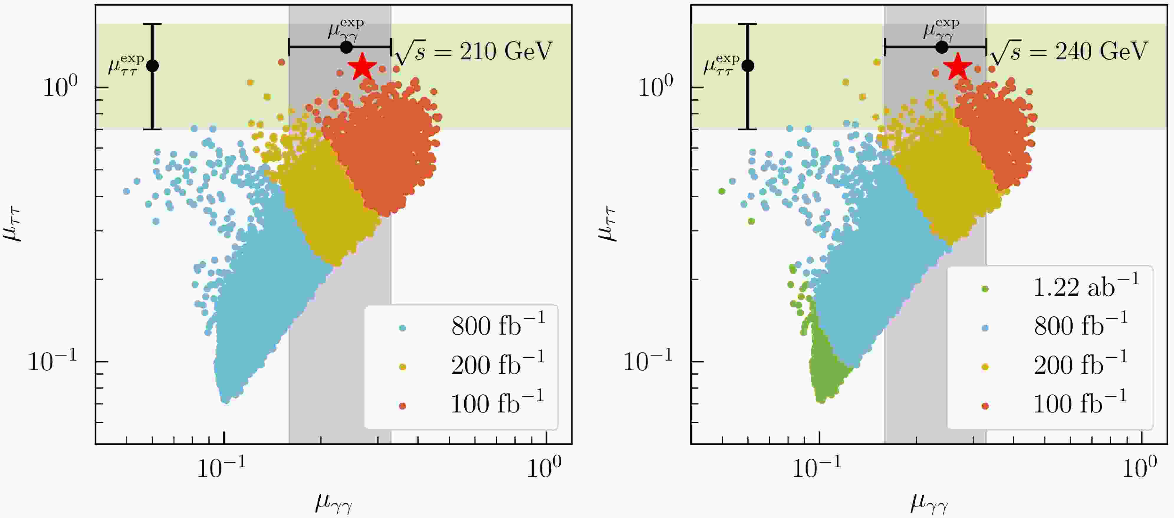 $ {\mu _{\tau \tau }}$ versus$ {\mu _{\gamma \gamma }}$ plane at$ \sqrt s $ = 210 GeV (left panel) and$ \sqrt s $ = 240 GeV (right panel). CEPC with L = 100, 200, 800, and 1.22 can cover the red, yellow, blue, and green samples at the 5σ level, respectively. All the surviving samples can be covered at 5σ for$ \sqrt s $ = 210 GeV with L = 800 and$ \sqrt s $ = 240 GeV with L = 1.22. The red star marks the best-fit point. The green and purple shaded bands indicate the experimental 1σ ranges for the$ {\tau ^ + }{\tau ^ - }$ and$ \gamma \gamma $ channels, respectively.Specifically, Fig. 5, which should have displayed the coverage ability of the CEPC for surviving samples, incorrectly shows the content of Fig. 4, resulting in duplication with Fig. 4. The version of Fig. 5 provided in this document serve as errata for the corresponding figure in the published paper.
