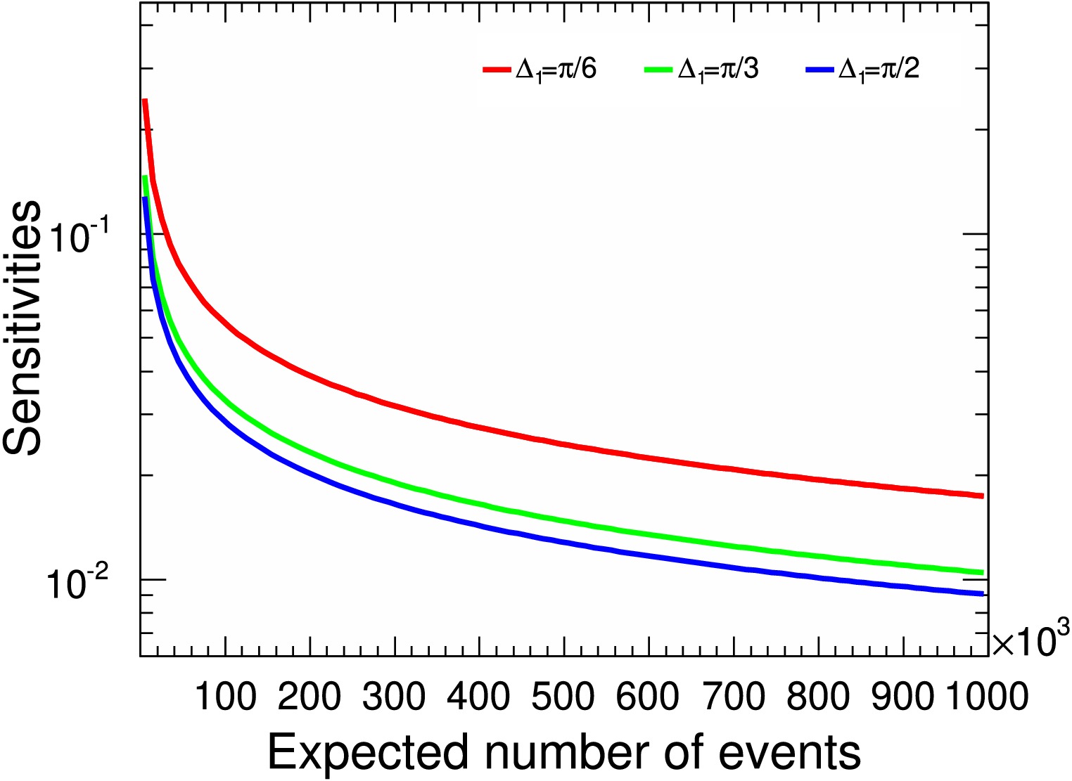 $ \gamma_{\Xi_c^+} $ sensitivity distributions relative to signal yields assuming$ \gamma_{\Xi^+_c}=0.5 $ . The$ \Delta_{1} $ values of$ \pi/6 $ ,$ \pi/3 $ , and$ \pi/2 $ correspond to the red, green, and blue lines, respectively.Next we consider the sensitivity estimation on