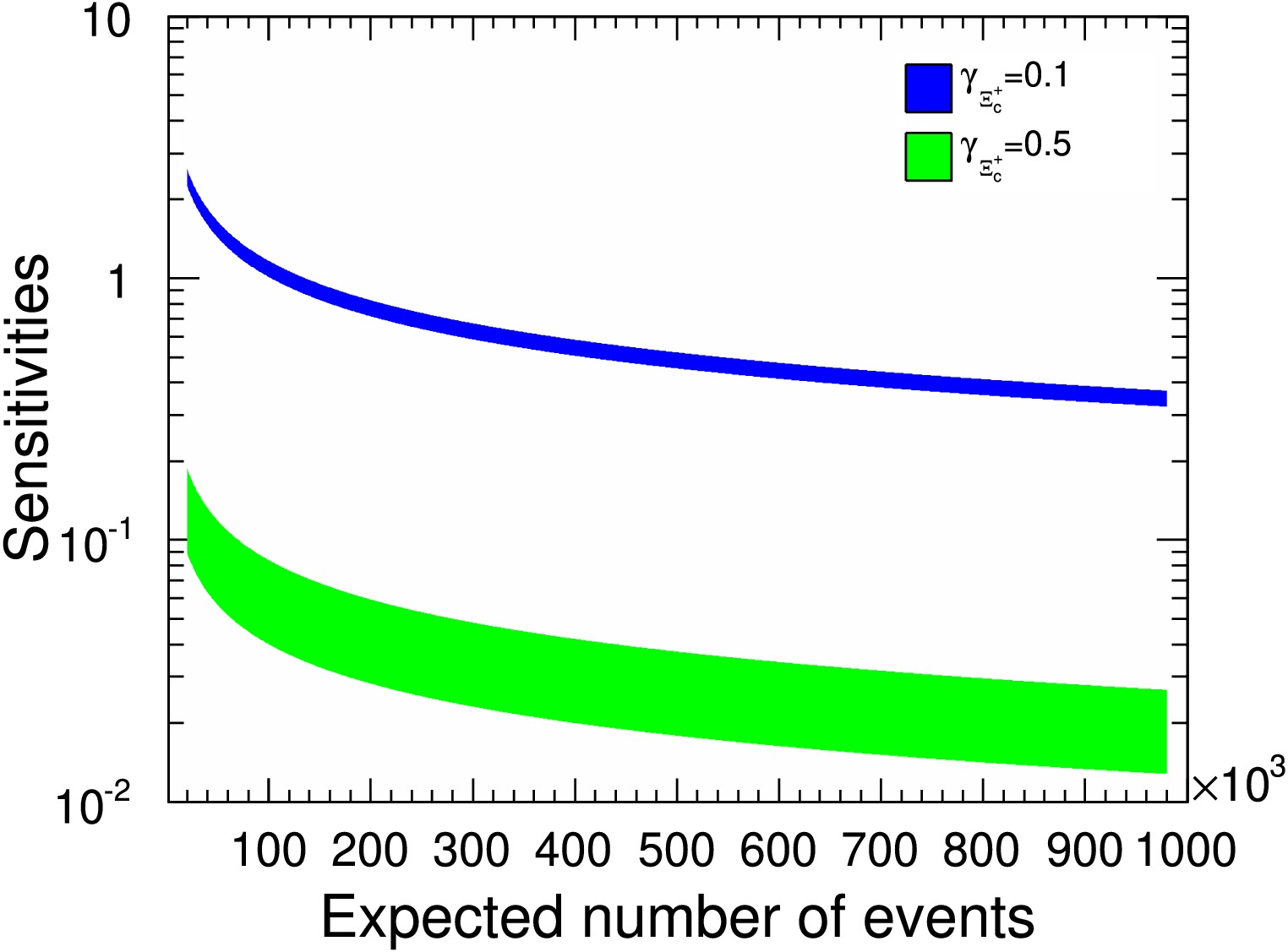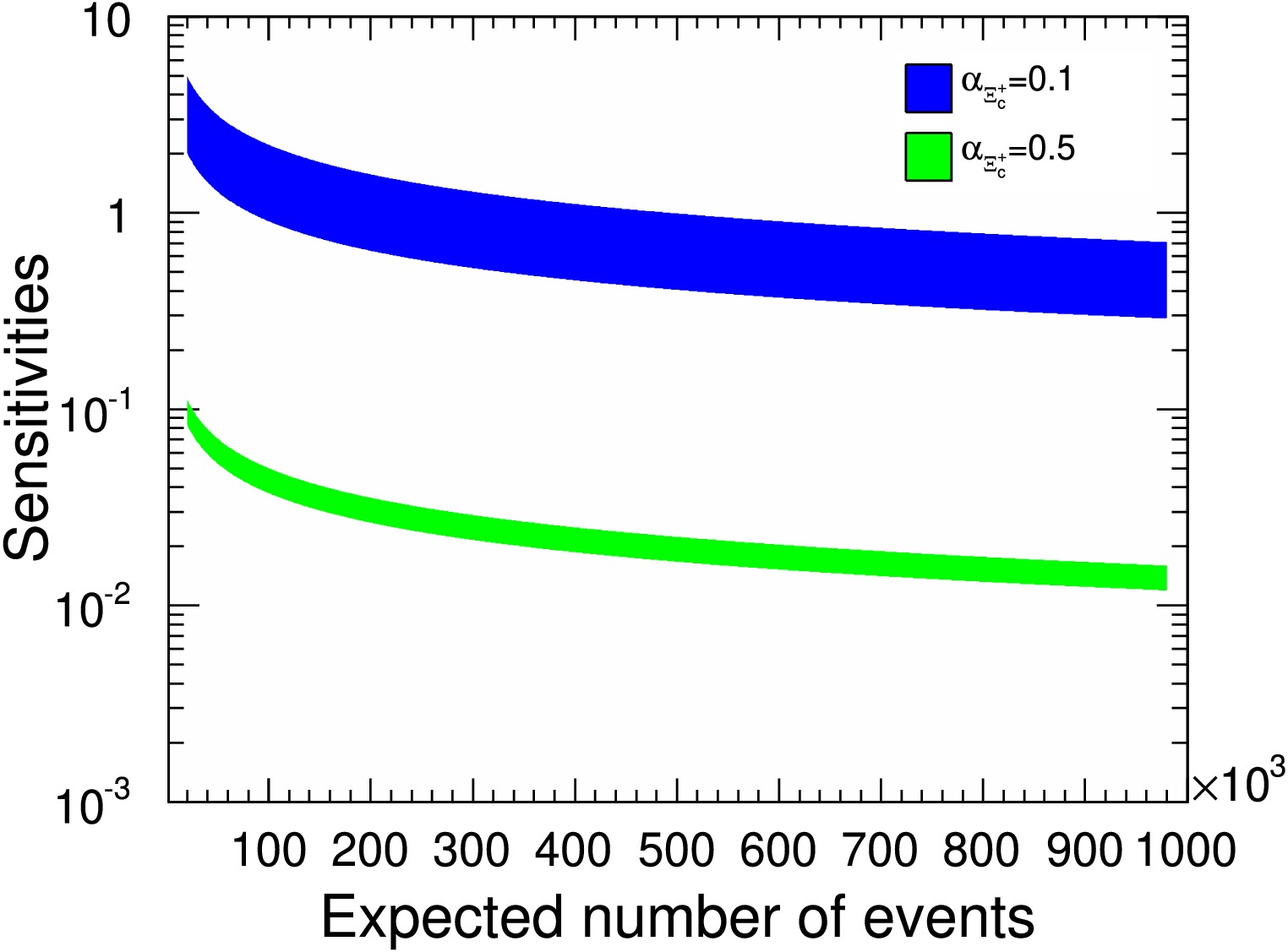 $ {\cal{A}}_{CP} $ sensitivity distributions relative to signal yields. The$ \alpha_{\Xi^+_c} $ values of$ 0.1 $ and$ 0.5 $ correspond to the blue and green bands, respectively.