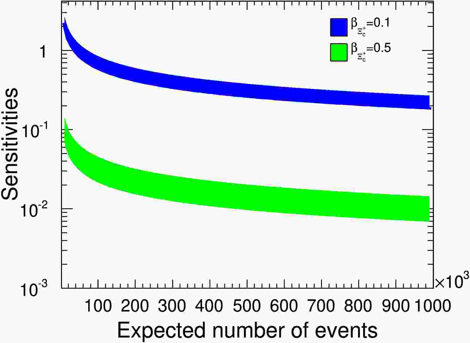 $ {\cal{B}}_{CP} $ sensitivity distributions relative to signal yields. The$ \beta_{\Xi^+_c} $ values of$ 0.1 $ and$ 0.5 $ correspond to the blue and green bands, respectively. -