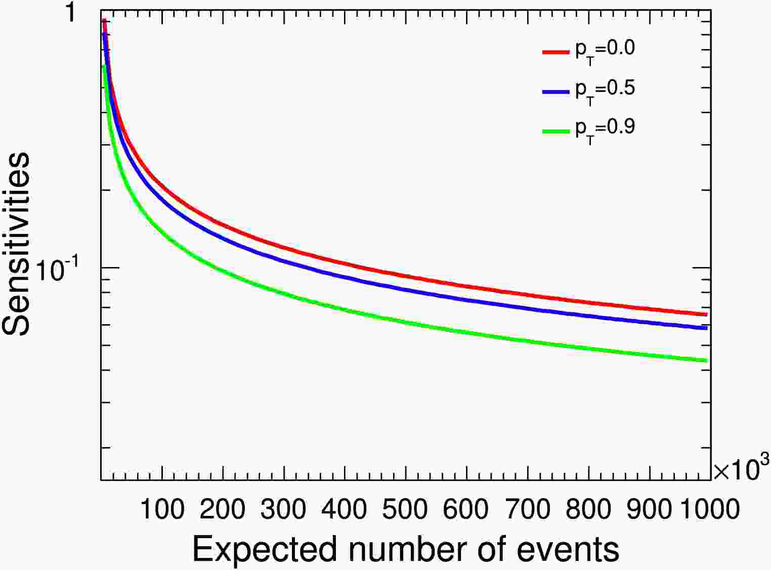 $ \gamma_{\Xi_c^+} $ sensitivity distribution relative to signal yields assuming$ \gamma_{\Xi^+_c}=0.5 $ . The$ p_{T} $ values of 0.0, 0.5, and 0.9 correspond to the red, green, and blue lines, respectively.