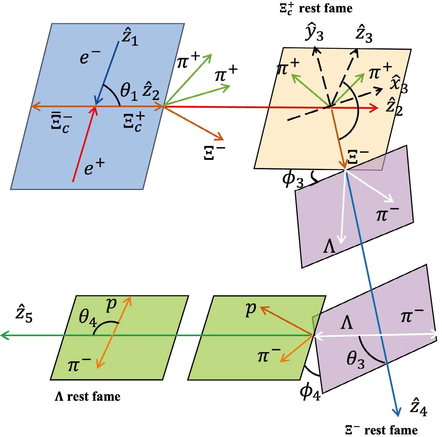 $ \Xi^+_c $ production and the collision plane is defined as$ \phi_1 $ . For the three-body decay of$ \Xi^+_c \to \Xi^- \pi^+ \pi^+ $ , the Euler angles$ (\phi_2,\theta_2,\psi_2) $ are used. The system is rotated from$ \hat{z}_{2} $ to$ \hat{z}_{3} $ following the ZYZ convention. In$ \Xi^- $ decays, a rotation from$ \hat{z}_{3} $ to$ \hat{z}_{4} $ is needed. Due to the rotational invariance of helicity, this rotation operation does not introduce any additional modifications. In fact, the angle$ \psi_2 $ will not contribute to integrated cross sections we are interested in, and the selection of pion does not alter amplitudes since the meson's spin is zero. -