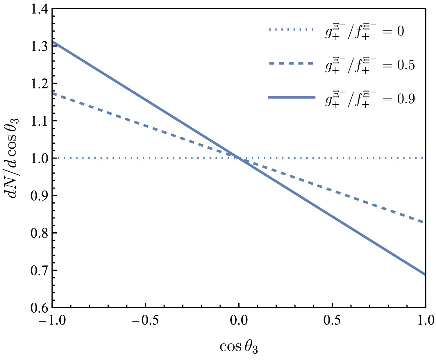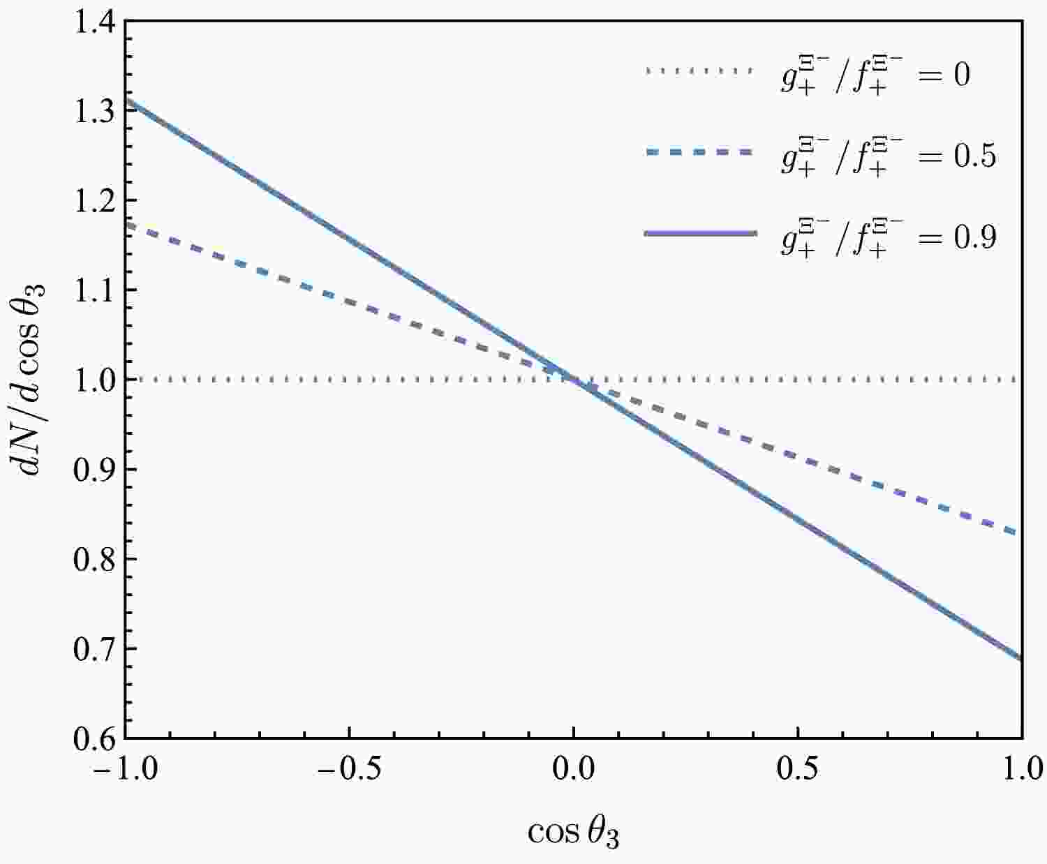 $ \cos\theta_3 $ for$ g^{\Xi^-}_+/f^{\Xi^-}_+=0 $ ,$ 0.5 $ ,$ 0.9 $ (dotted, dashed and solid lines, respectively).The angular distribution after normalization is defined by
