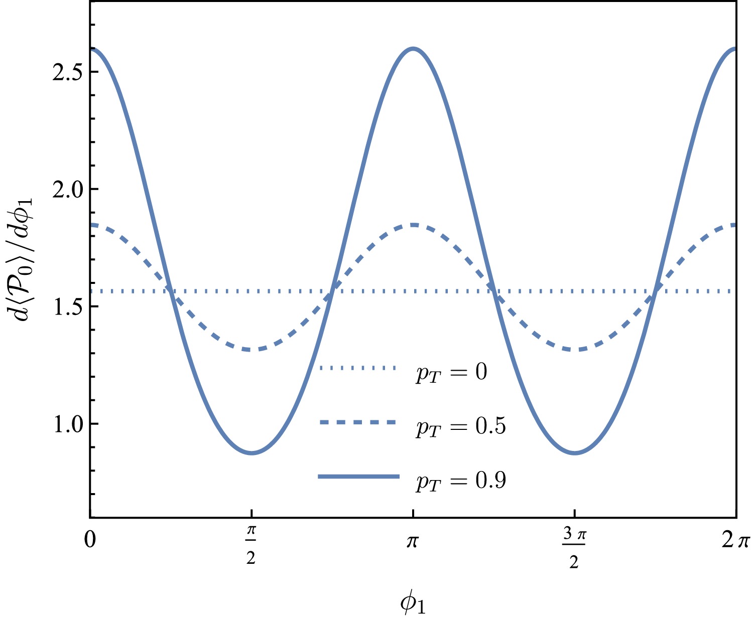 $ {{\cal{P}}}_0 $ as a function of$ \phi_1 $ for$ p_T=0 $ ,$ 0.5 $ ,$ 0.9 $ (dotted, dashed and solid lines, respectively).