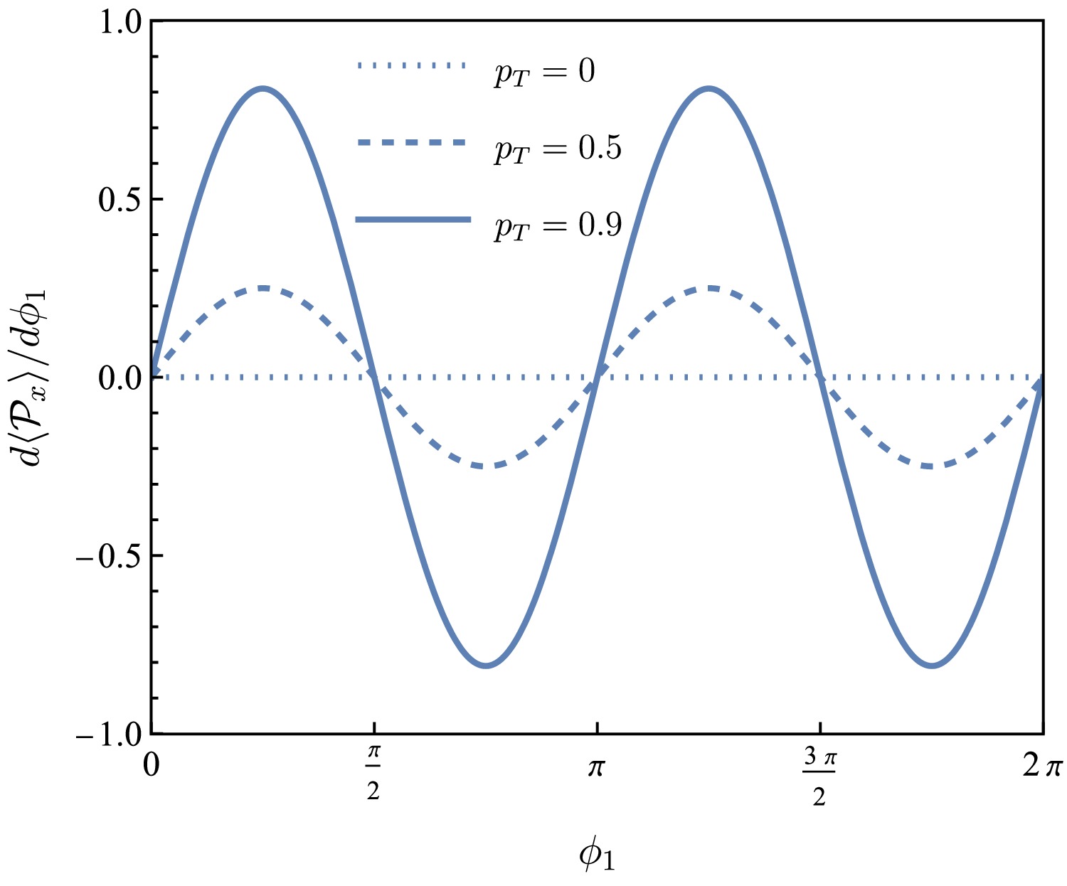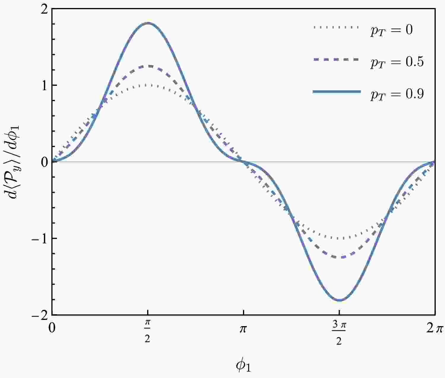 $ {{\cal{P}}}_x $ as a function of$ \phi_1 $ for$ p_T=0 $ ,$ 0.5 $ ,$ 0.9 $ (dotted, dashed and solid lines, respectively).