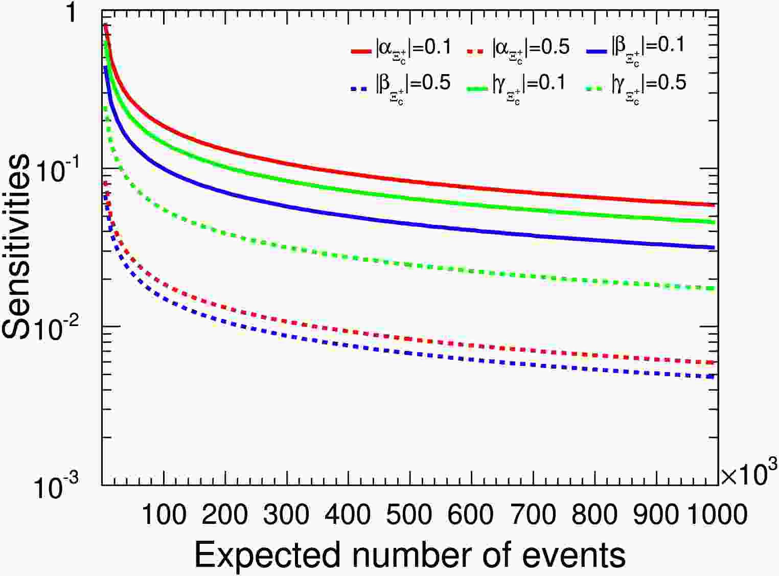 $ \alpha_{\Xi_c^+} $ ,$ \beta_{\Xi_c^+} $ , and$ \gamma_{\Xi_c^+} $ sensitivity distributions relative to signal yields in terms of different parameters. The red solid and dashed lines represent the$ \alpha_{\Xi_c^+} $ values of 0.1 and 0.5, respectively. The blue solid and dashed lines represent the$ \beta_{\Xi_c^+} $ values of 0.1 and 0.5, respectively. The green solid and dashed lines represent the$ \gamma_{\Xi_c^+} $ values of 0.1 and 0.5, respectively.In Fig. 9, The statistical significance of