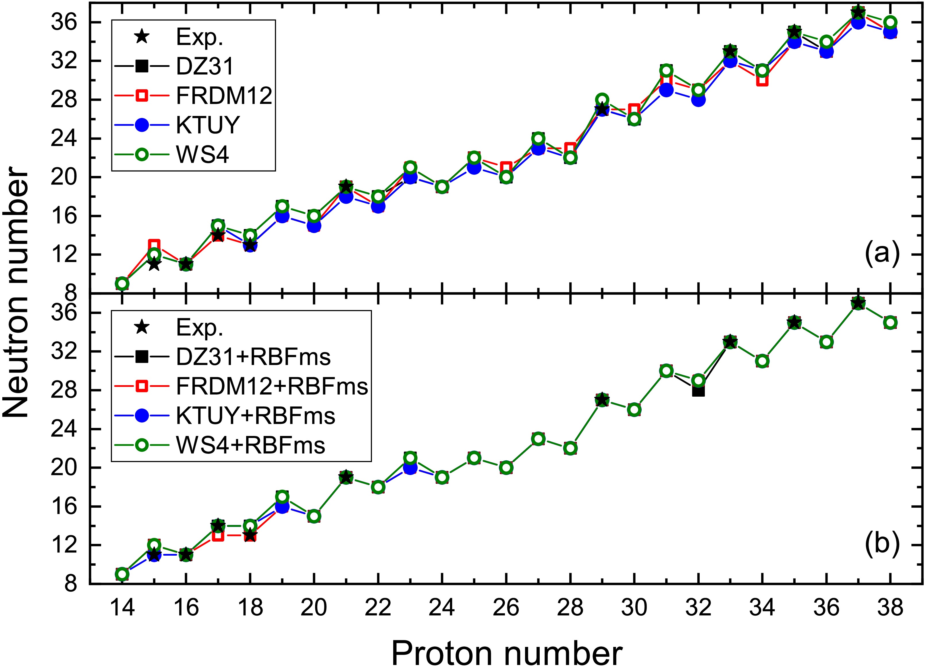 $ Z=14-38 $ through an integrated method combining DZ31, FRDM12, KTUY, and WS4 mass models with the RBFms approach. This learning set used for prediction also incorporates the test set data mentioned above. The proton drip line positions in isotope chains are determined by distinct criteria for odd-Z and even-Z nuclei. For odd-Z nuclei, the outermost nucleus with positive one-proton separation energy ($ S_{\rm{p}} > 0 $ ) defines the drip line boundary. For even-Z nuclei, the criterion involves two-proton separation energy ($ S_{\rm{2p}} > 0 $ ), where the outermost nucleus satisfying this condition marks the drip line position. Figure 3 illustrates the proton drip line positions for nuclei with$ Z=14-38 $ predicted by the DZ31, FRDM12, KTUY, and WS4 models, including results predicted by their combined with the RBFms approach. Figure 3 demonstrates that while the DZ31, FRDM12, KTUY, and WS4 models yield quantitatively similar predictions, observable discrepancies persist. However, upon integration with the RBFms approach, the results from these models exhibit significantly improved consistency across most cases. This further demonstrates the effectiveness of the RBFms approach. Finally, Table 1 presents the predicted average values of one-proton and two-proton separation energies for a small number of atomic nuclei (possibly the ground-state two-proton decay nuclei). These average values are calculated by combining the prediction results of the DZ31, FRDM12, KTUY and WS4 models with the RBFms approach.