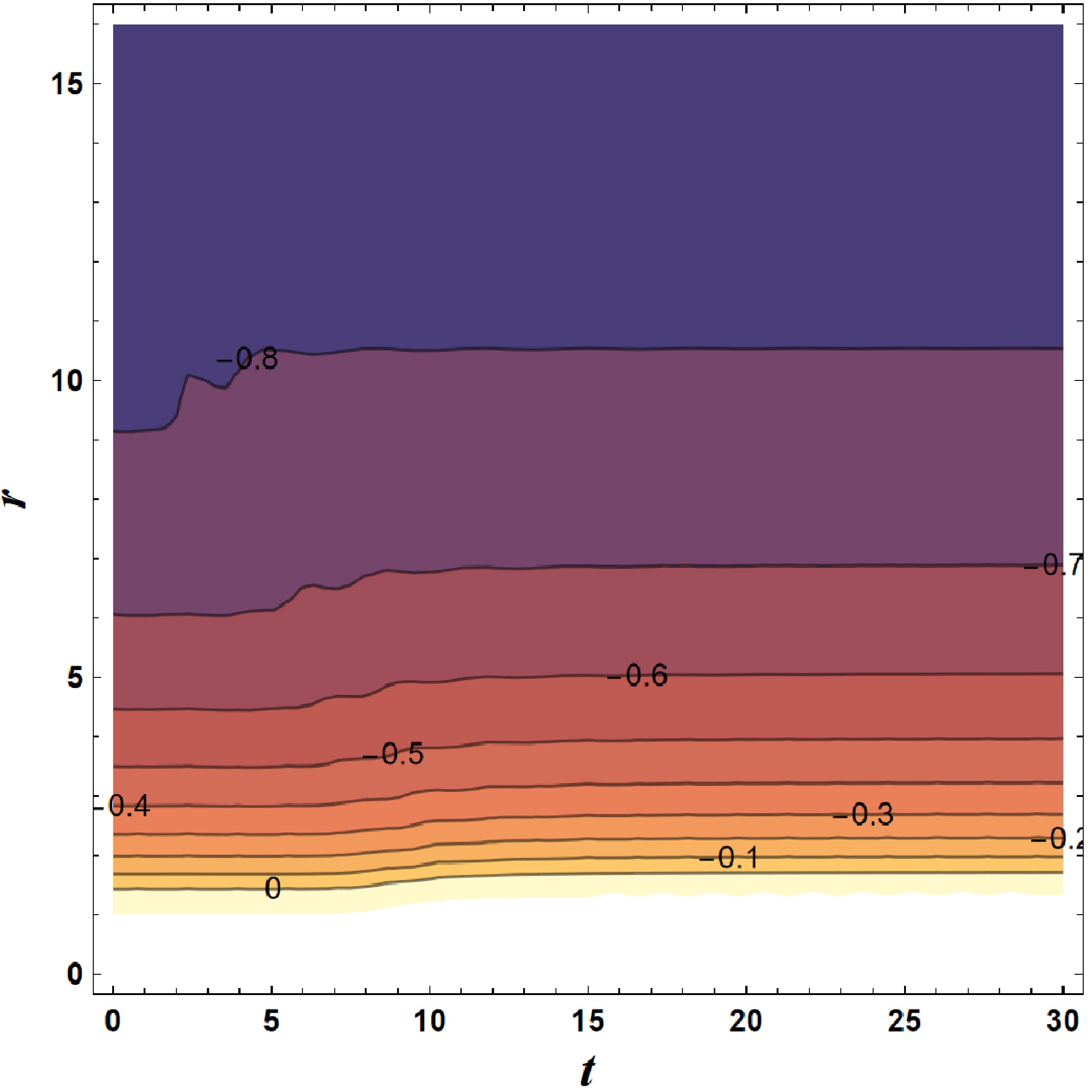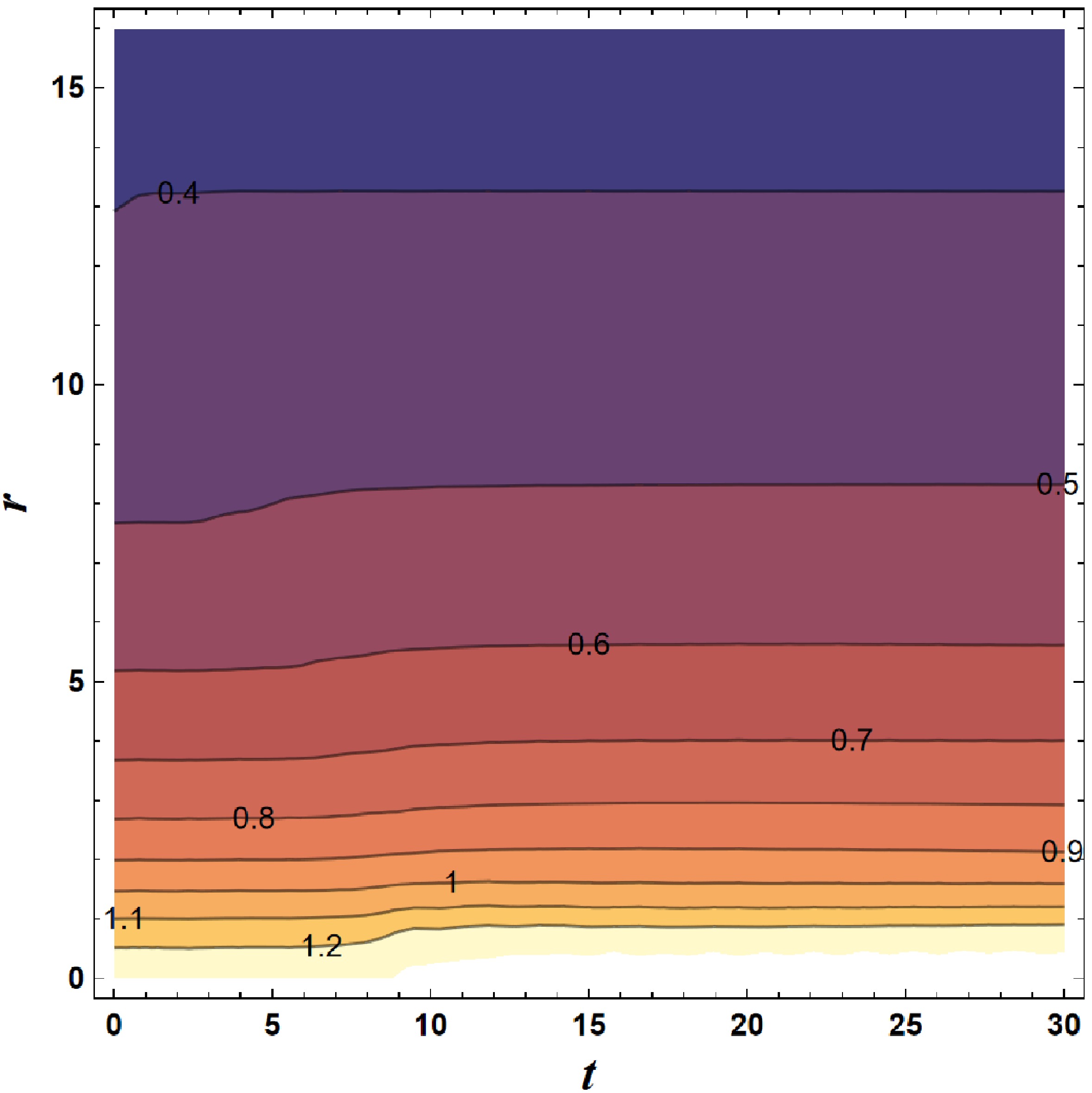 $ \psi(t,r) $ , the gauge potential$ A(t,r) $ , and metric {$ \alpha(t,r), \zeta(t,r) $ } over all positions (r) and all times (t). In this paper, we set the potential$ V(\psi)=|\psi|^{2}(1-\dfrac{|\psi|^{2}}{0.1^{2}})^{2}, M=1.09239 $ , the total charge$ Q=0.9 $ , and$ q=3 $ .Figure 1 illustrates the contour plot of the metric component