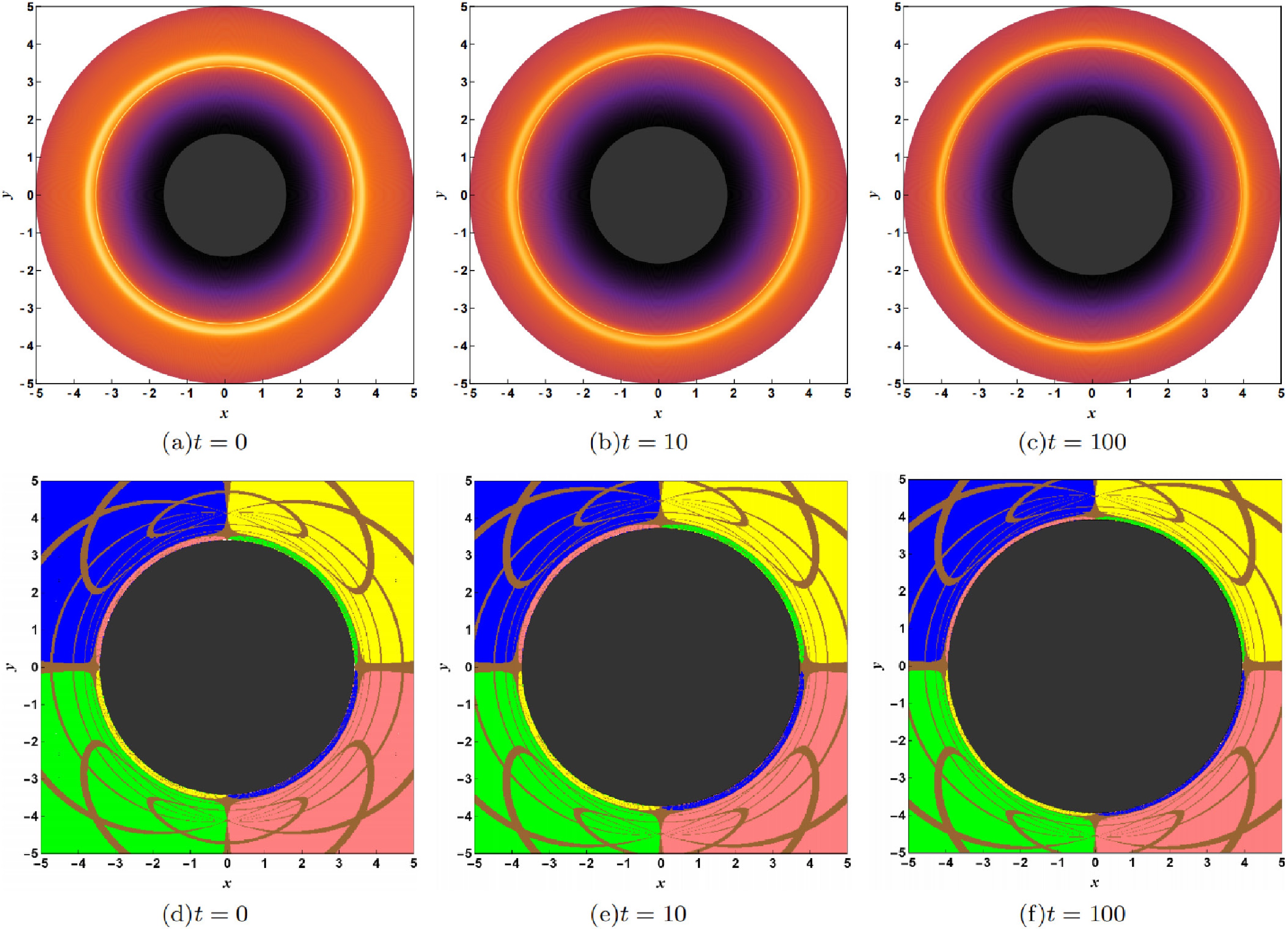 Figure 12. (color online) The black hole images with and without an accretion disk when t = 0, 10, and 100. The upper row shows the images of the black hole with an accretion disk. The bottom row illustrates the black hole shadow images without an accretion disk.