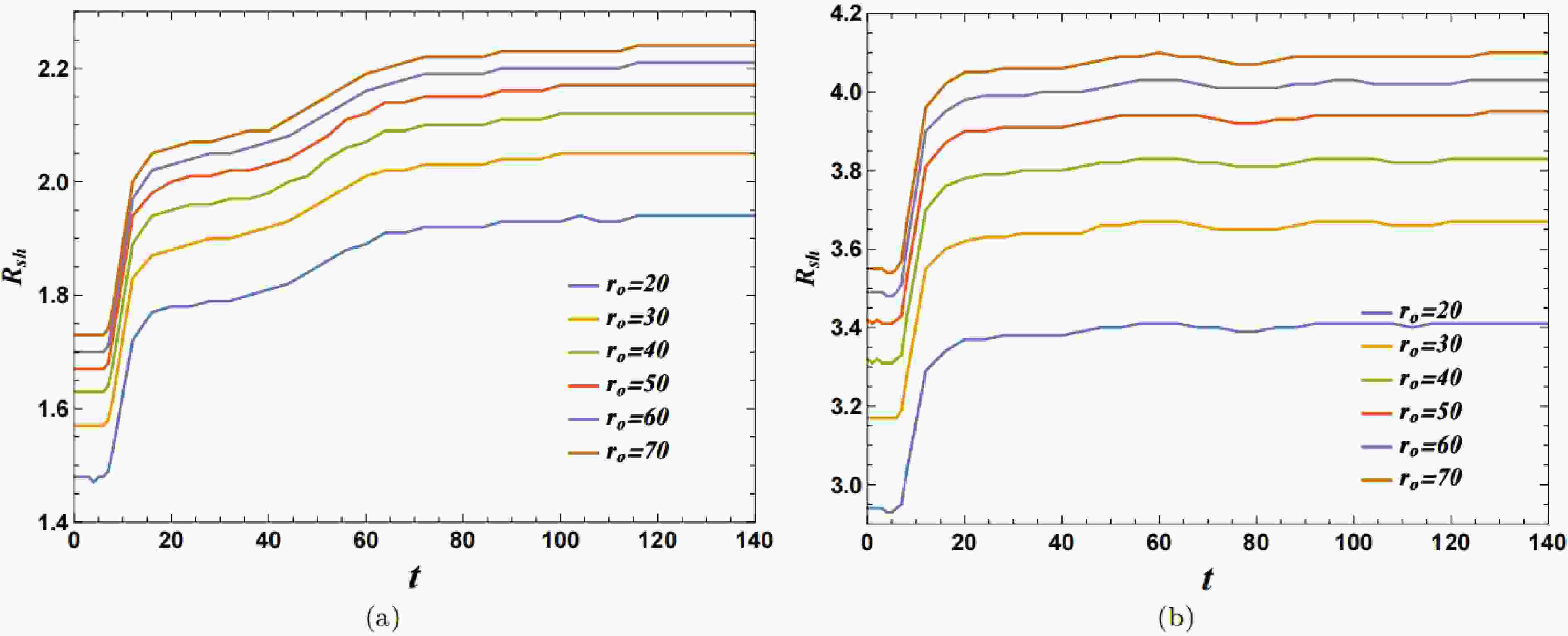 $ R_{\rm sh} $ with observer time$ t_{\rm o} $ for different observer distances$ r_{\rm o} $ . (a) Shadow radius$ R_{\rm sh} $ for this dynamic black hole with an accretion disk. (b) Shadow radius$ R_{\rm sh} $ without an accretion disk.To investigate the characteristics of the black hole shadow at every time point, we slice the dynamical spacetime into spacelike hypersurfaces at different times t. At every spacelike hypersurface, the time t is fixed. We can study the black hole shadow in the spacelike hypersurface at any moment. Figure 12 shows the black hole shadows with