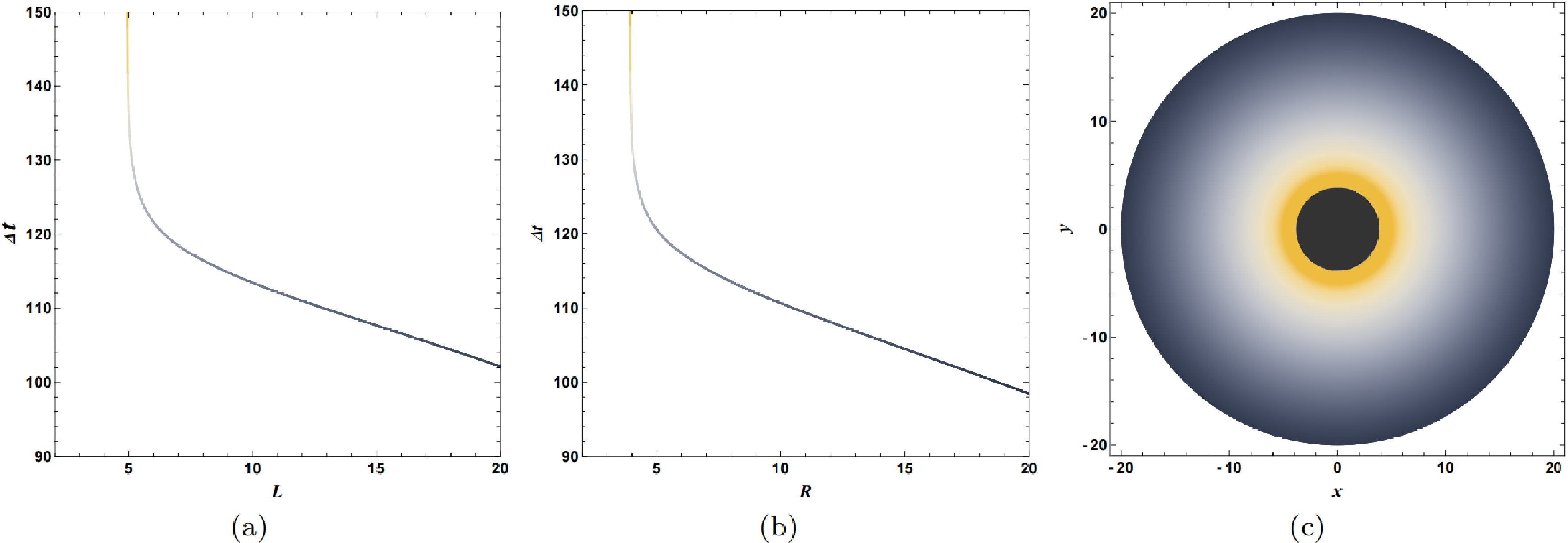 $ \Delta t=t_{\rm o}-t_{\rm s} $ of light propagating from the accretion disk to the observer. (a) Variation in the time delay$ \Delta t $ with the angular momentum L. (b) Variation in the time delay$ \Delta t $ with the radius R on the observer's screen. (c) Density plot of the time delay$ \Delta t $ of light in the black hole image, in which the gray inner region represents the black hole shadow.In the absence of an accretion disk, light propagates from a spherical background light source with radius