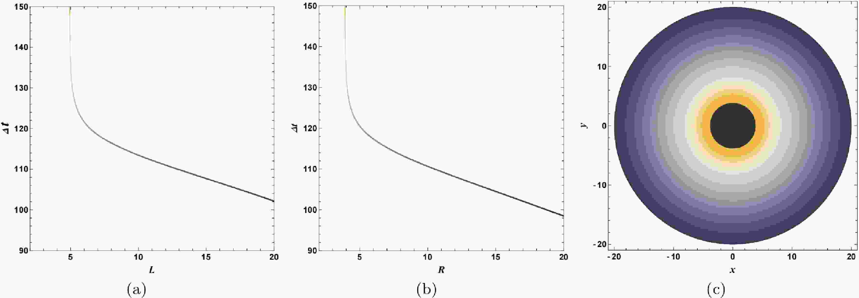 $ r_{s}=50 $ to observer. Figure 15 illustrates the time delay$ \Delta t=t_{o}-t_{s} $ of lights propagating from the light source to observer. Here, the observer is located at$ r_{o}=50 $ , and the observer time$ t_{o}=170 $ . Figure 15 (a) and (b) exhibit the variation of time delay$ \Delta t $ with angular momentum L and the radius R on the observer's screen, respectively. Initially, when L is small, the time delay$ \Delta t $ approaches infinity because the corresponding light rays spiral asymptotically toward the photon sphere, where they can orbit the black hole multiple times. And then the time delay$ \Delta t $ decreases as L or R increases. Figure 15 (c) exhibits the density plot of the time delay$ \Delta t $ of lights in black hole image, in which the gray inner region represents the black hole shadow.