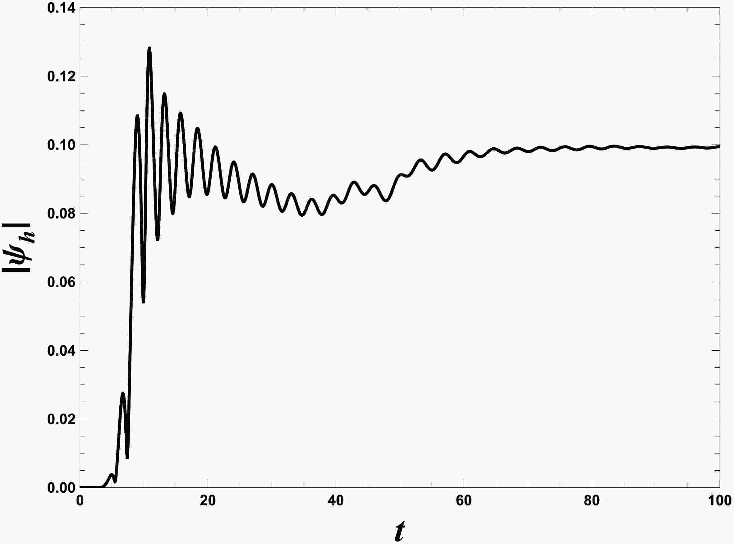 $ g_{tt} $ as functions of time t and radial coordinate r. The contour line of$ g_{tt}=0 $ corresponds to the location of the apparent horizon$ r_{h} $ , which increases with time t. The$ g_{tt} $ has little variation with t and asymptotically approaches$ -1 $ as r tends to infinity. Figure 2 displays a contour plot of$ g_{tr} $ as a function of t and r. The$ g_{tr} $ also has little variation with t and asymptotically approaches 0 as r tends to infinity. The metric of this dynamic black hole describes an asymptotically flat spacetime. The complex scalar field$ \psi(t, r) $ of this black hole is a function of t and r. Figure 3 depicts how the magnitude of the complex scalar field on the horizon$ |\psi_{h}| $ changes over time. Initially,$ |\psi_{h}|=0 $ , and at this point, the black hole has not yet acquired scalar hair. Then there is a sharp rise followed by rapid oscillations. As time progresses, the oscillation gradually dampen, and then the magnitude tends toward stabilization.