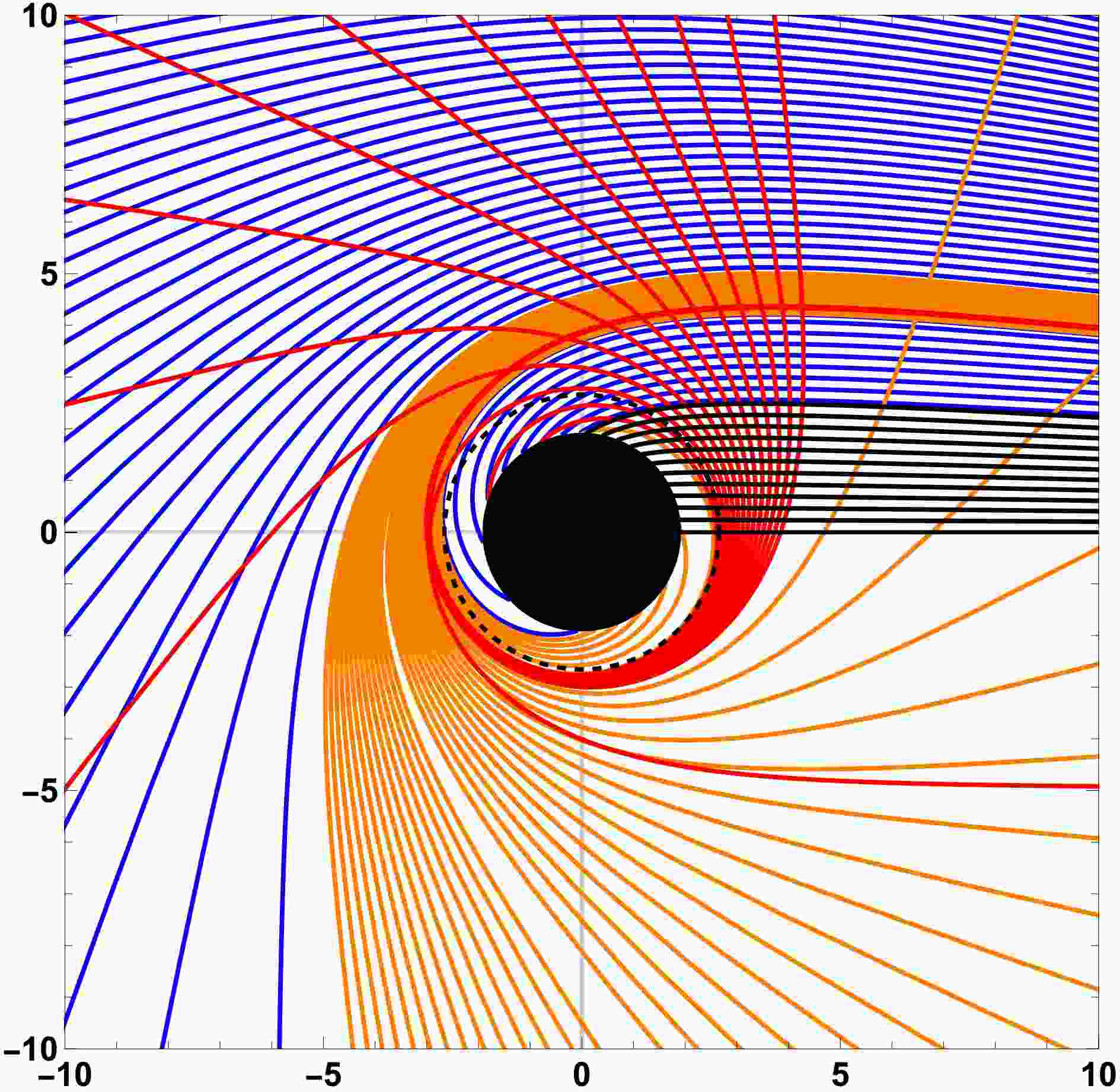 Figure 5. (color online) Light rays corresponding to shadow (black), direct emission (blue), lensing rings (orange), and photon rings (red). The black disk represents the black hole, and the observer is positioned to its right at a distance of
