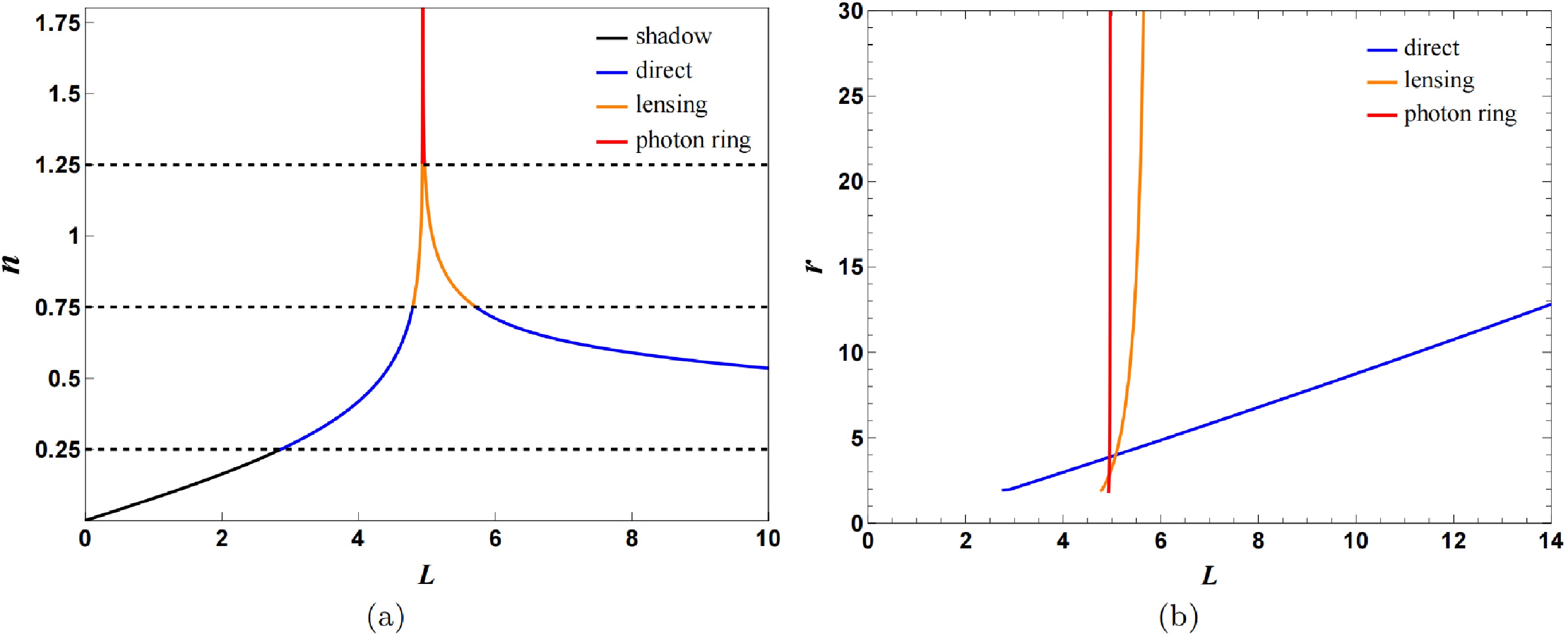 Figure 6. (color online) (a) Variation in the total number n with the angular momentum L. The black hole shadow satisfies the condition