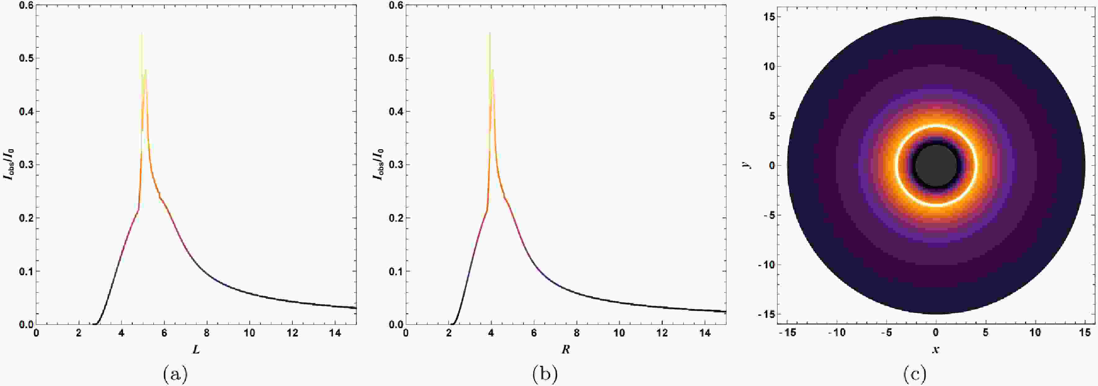 $ p_{\mu} $ is the 4-momentum of the photon,$ u_{o}^{\mu}=(1/\sqrt{-g_{tt}|_{(t_{o},r_{o})}}, 0, 0, 0) $ is the 4-velocity of the static observer, while$ u_{e}^{\mu}=(1/\sqrt{-g_{tt}|_{(t_{e},r_{e})}}, 0, 0, 0) $ is the 4-velocity of the accreting gas emitting the radiation. Figure 8 shows the observational appearance of the accretion disk, which viewed from a face-on by the observer with radius$ r_{o}=50 $ and time$ t_{o}=170 $ . In other words, this is the image of the black hole captured by the observer at the local time$ t_{o}=170 $ . Figure 8 (a) and (b) exhibit the profiles of observed intensity$ I_{obs} $ as a function of the angular momentum L and radial coordinate$ R=\sqrt{x^{2}+y^{2}} $ in observer's sky, respectively. Here$ (x, y) $ are the celestial coordinates. Figure 8 (c) exhibits the density plot of the observed intensity$ I_{obs} $ in observer's sky, in which the gray region represents the black hole shadow. Due to the redshift factor g, the observed intensity$ I_{obs} $ are not like the emitted specific intensity$ I_{em} $ , which arises from horizon, and increases from direct emission to lensing ring, and reach peak in photon ring as L increases. Then it falls down as L continues to increase. The direct emission dominates a significant portion, constituting the major part in the black hole image. The lensing ring is much brighter than direct emission, forms a brilliant, glowing halo in black hole image. Although the photon ring exhibits the highest brightness, it is so narrow that its contribution can be ignored.