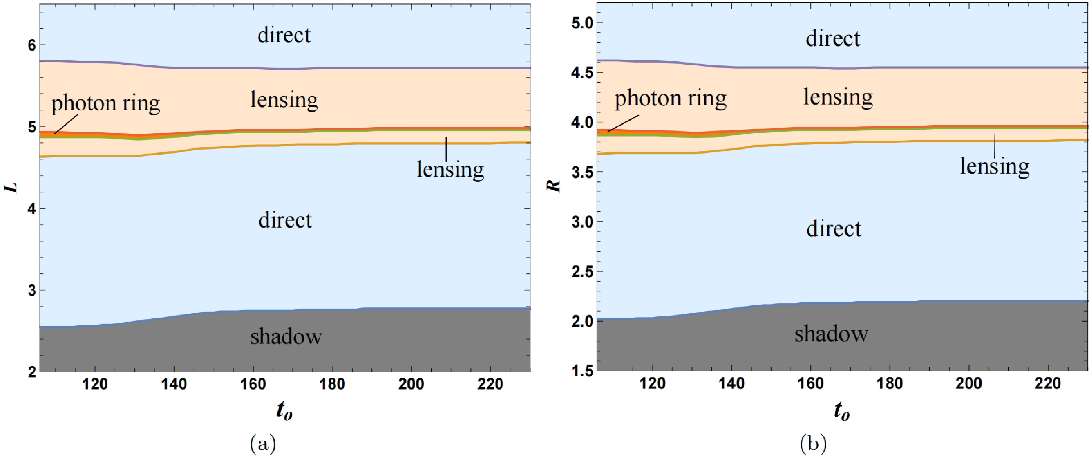 $ t_{o} $ are shown in Fig. 9. And the observer is located at$ r_{o}=50 $ . The shadow range increases over time$ t_{o} $ . The range of direct emission is divided into two parts, and the entire range remains almost invariant with respect to$ t_{o} $ . The range of lensing ring is also divided into two parts, but the entire range decreases over$ t_{o} $ . While the range of photon ring is very narrow, and decreases over$ t_{o} $ .