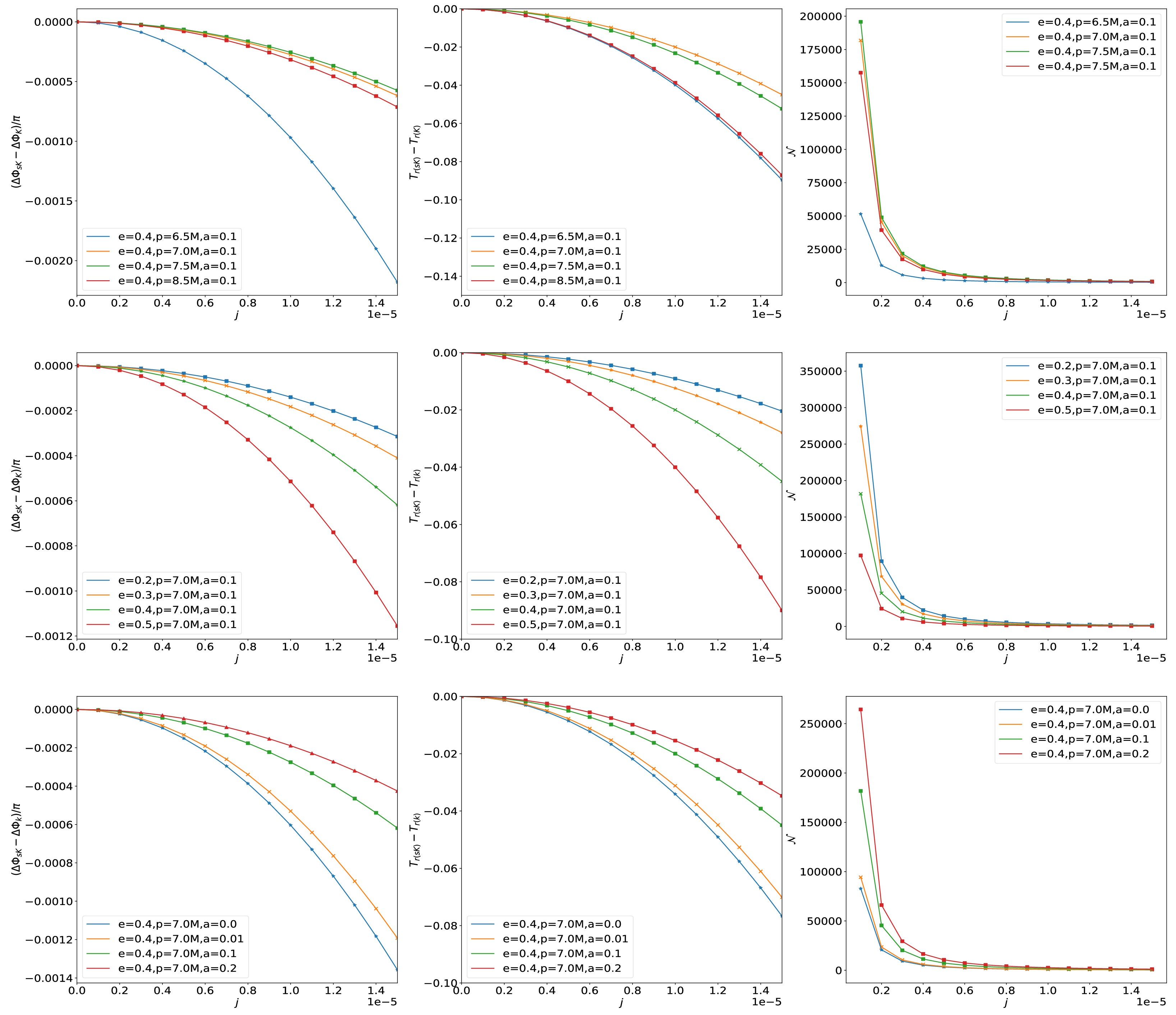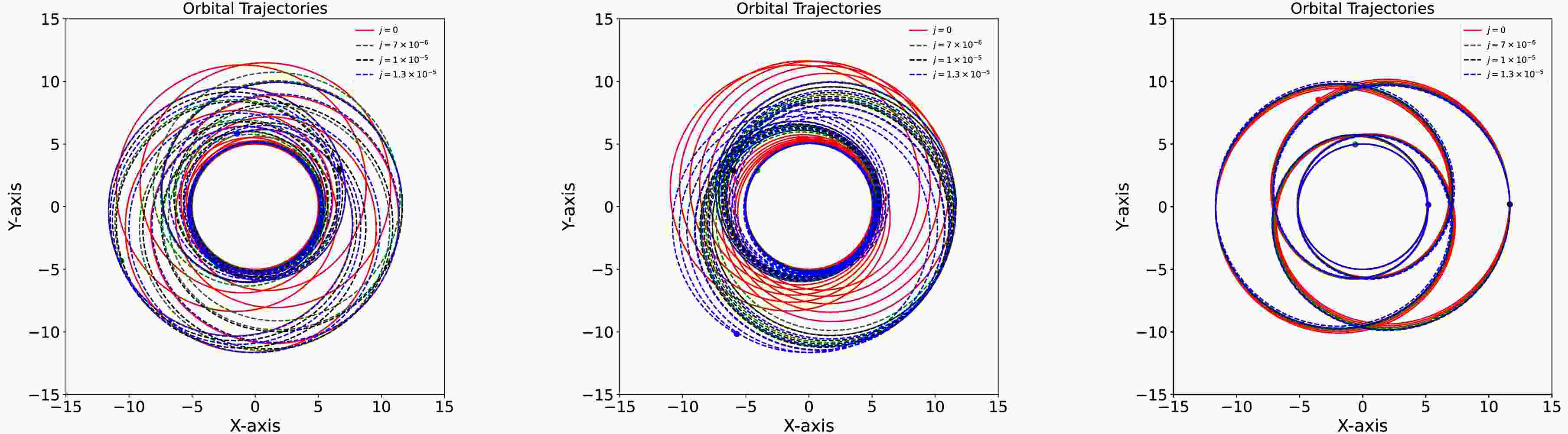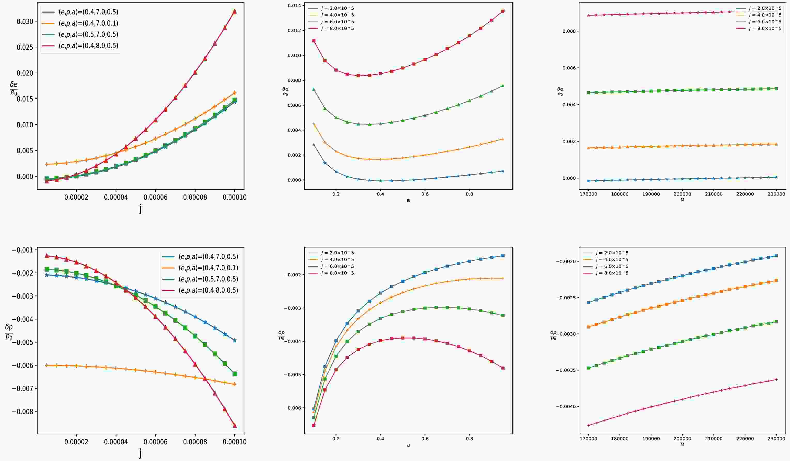 Figure 8.  (color online) Relation between relative varied orbit parameters for different black hole parameters when equating orbital frequencies, i.e., the orbits of $ (0, a, M, e_0, p_0) $ and $ (j, a, M, e_0+ \delta e, p_0+ \delta p) $ have the same orbital frequencies. The black hole spin parameter is set to $ a = 0.5 $ in the left and right panels, and the black hole mass parameter is set to $ M = 2\times10^{5}M_{\odot} $ in the left and middle panels. The orbit parameters are set to $ e_0 = 0.4 $ and $ p_0 = 7.0 $ in each panel.