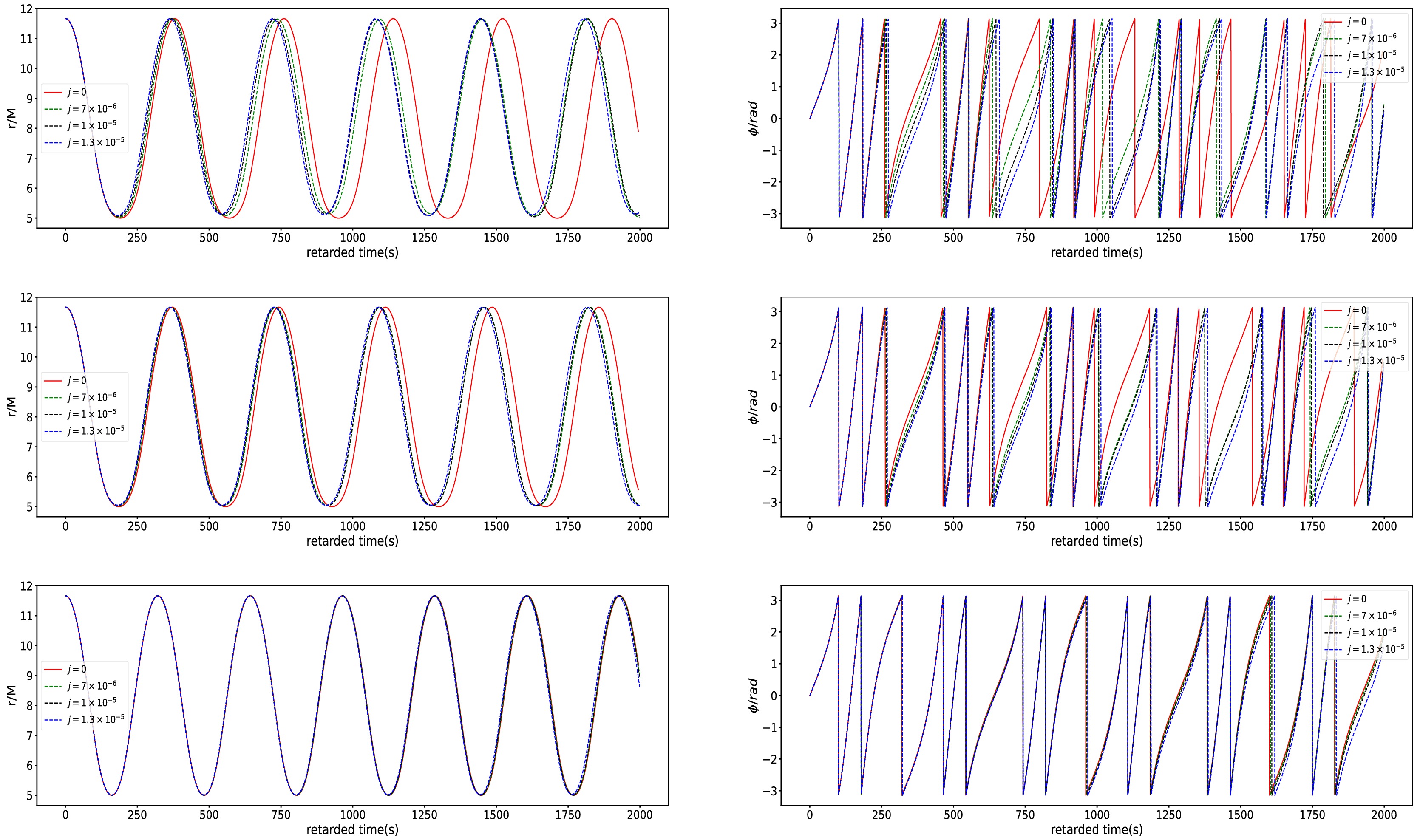 Figure 2.  (color online) Time series of the orbital motion with the orbital parameters $ e = 0.4 $ and $ p = 7.0M $ in the swirling Kerr spacetime for different j. The left panel and the right panel respectively correspond to the motion in the r-direction and ϕ-directions. The top, middle and bottom rows respectively denote $ a = 0.0 $, $ a = 0.01 $ and $ a = 0.1 $.