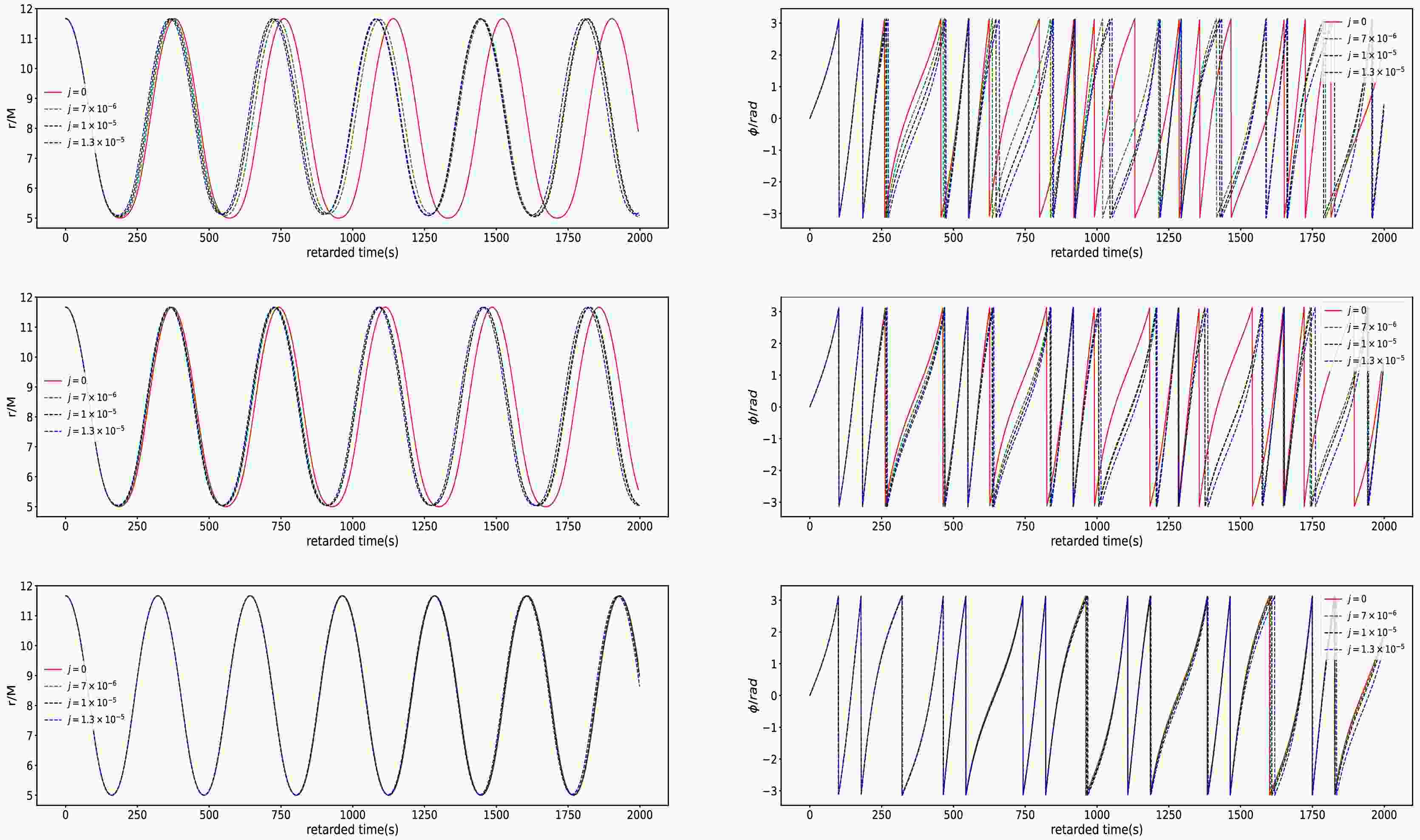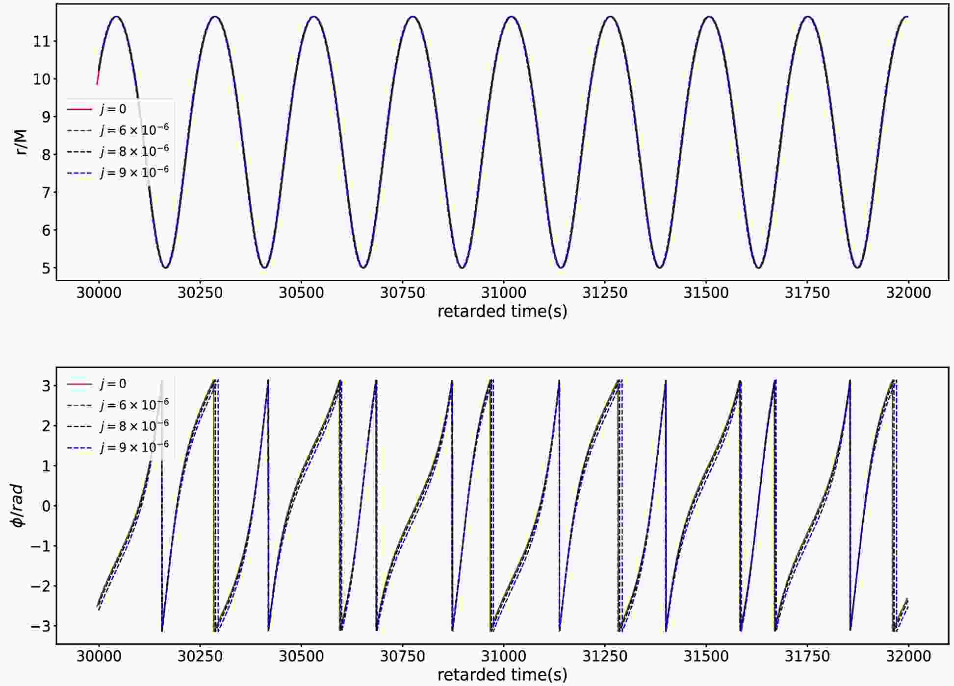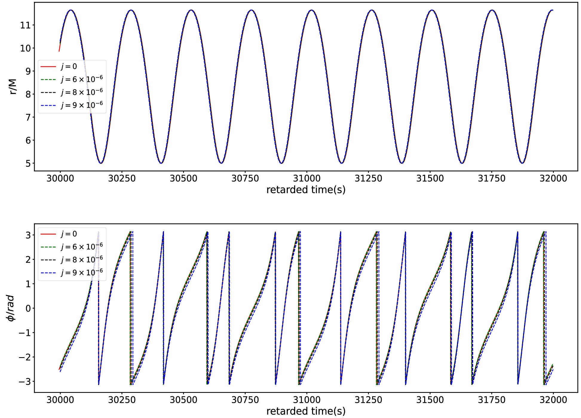 • Let us now to probe effects of the swirling parameter together with the black hole spin parameter on EMRI gravitational waves using the numerical Kludge method. In our numerical analysis, the primary mass M and the secondary mass as μ are respectively set as $ M = 2\times10^5 M_{\odot} $ (solar mass) and $ \mu = 2M_{\odot} $, which means the mass ratio $ \eta = \mu/M = 10^{-5} $. The observed angular parameters are set to $ \Theta = \pi/4 $, $ \Phi = 0 $, and the luminosity distance is $ D_L = 5Gpc $. To evaluate the effect of the rotation parameter j on the EMRI gravitational waves, we focus only on orbital evolutions on the equatorial plane, which are determined by conservative dynamics without explicitly considering radiative reactions.