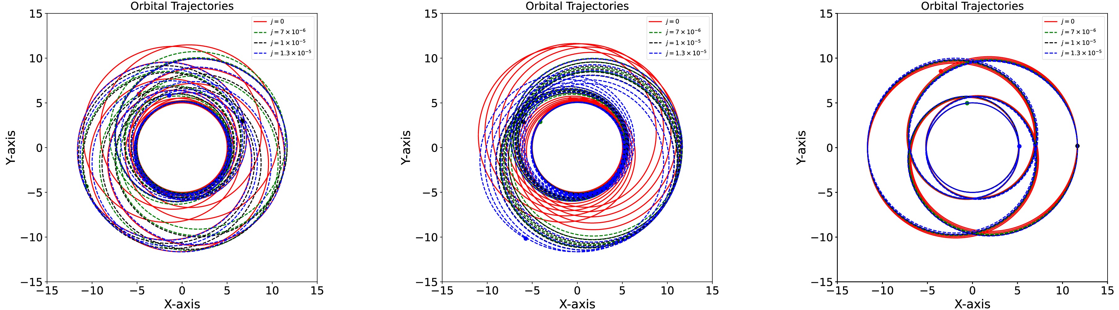 Figure 3.  (color online) Trajectories with the orbital parameters $ e = 0.4 $ and $ p = 7.0M $ in the swirling Kerr spacetime for different swirling parameters j. The left, middle and right panels respectively correspond to cases $ a = 0 $, $ a = 0.01 $ and $ a = 0.1 $.