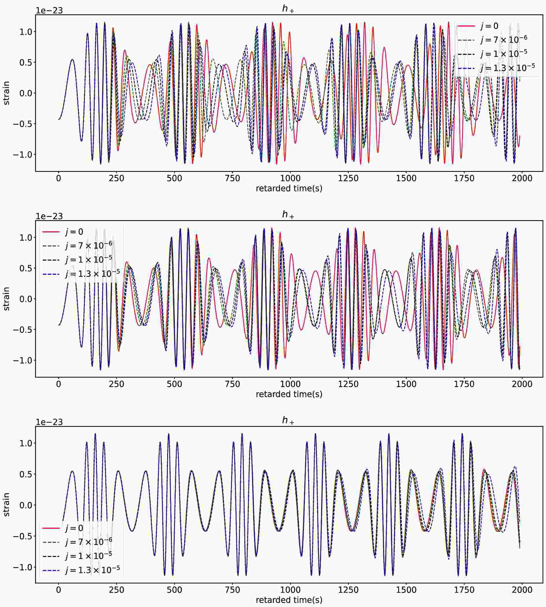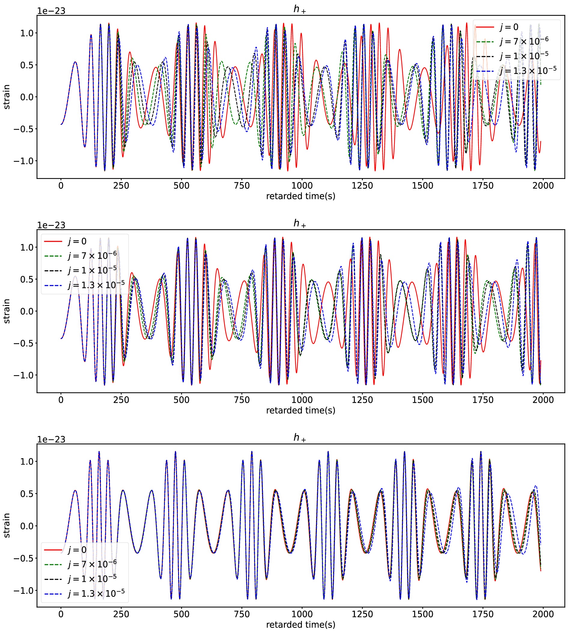 Figure 4.  (color online) The plus component of EMRI waveforms for different swirling parameter j. The top, middle and bottom rows respectively correspond to the cases with centre black hole's spin $ a = 0.0 $, $ a = 0.01 $, $ a = 0.1 $. Here, we set the orbital parameters to $ e = 0.4 $ and $ p = 7.0M $.