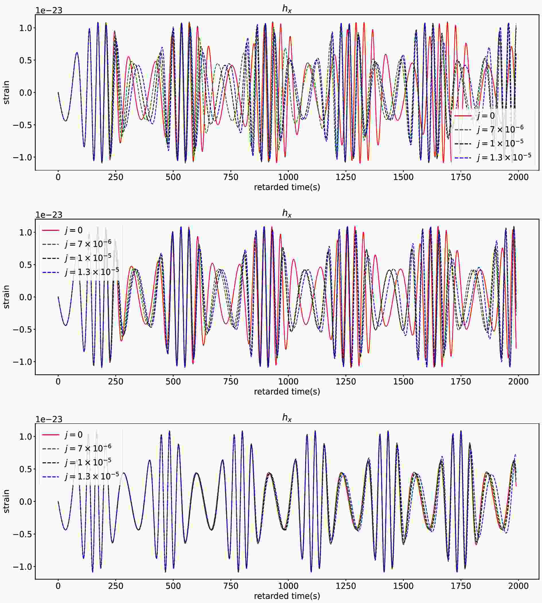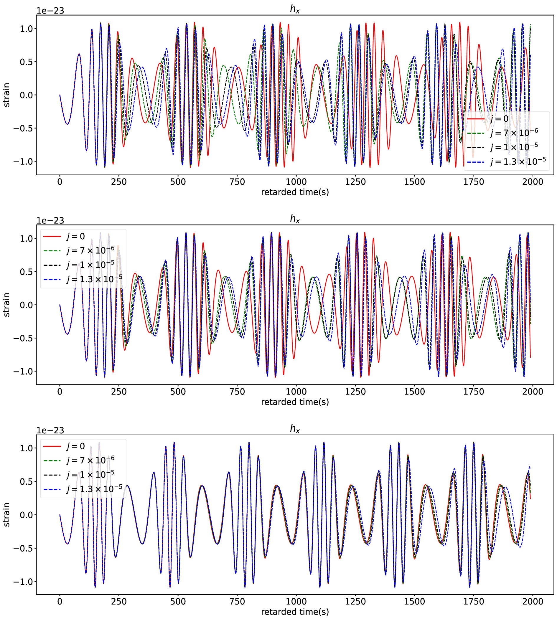 Figure 5.  (color online) The cross component of EMRI waveforms for different swirling parameter j. The top, middle and bottom rows respectively correspond to the cases with centre black hole's spin $ a = 0.0 $, $ a = 0.01 $, $ a = 0.1 $. Here, we set the orbital parameters to $ e = 0.4 $ and $ p = 7.0M $.