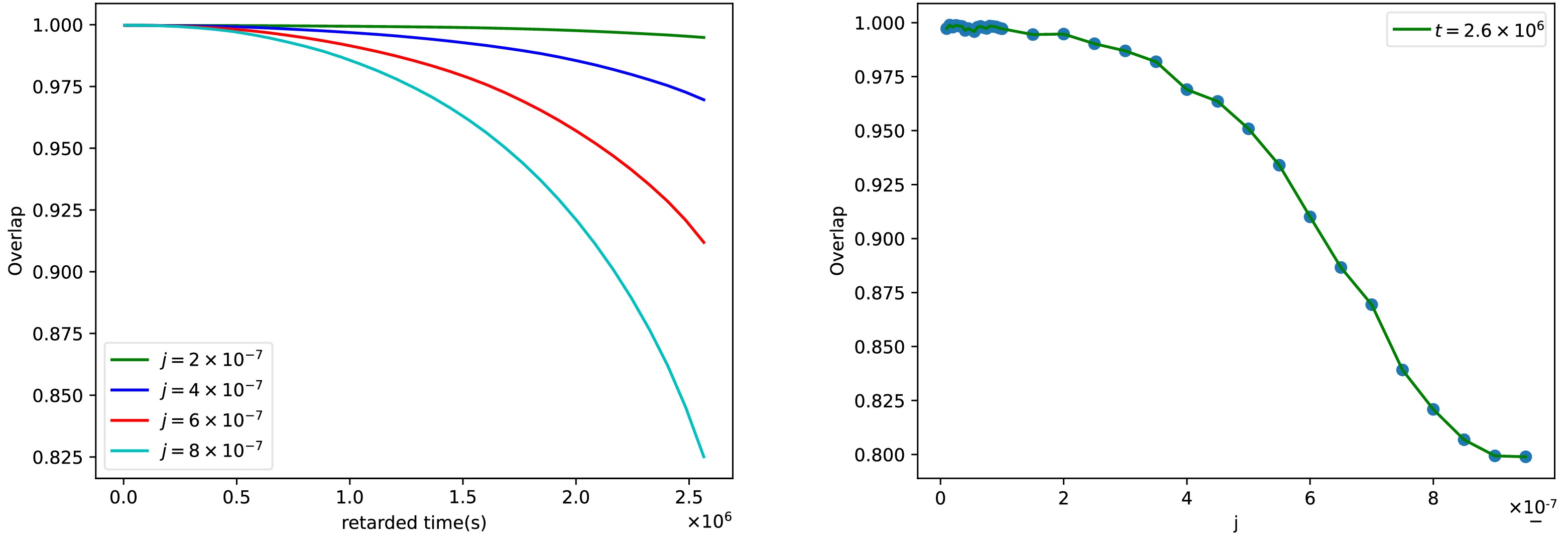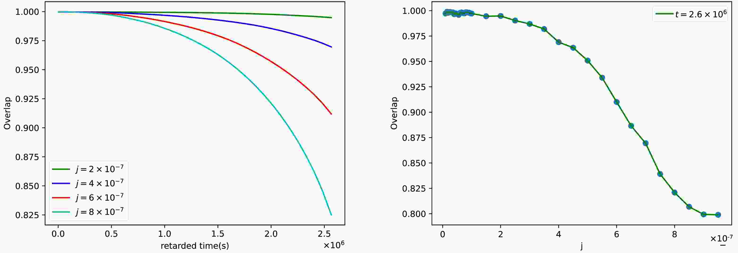 Figure 7.  (color online) The overlap between Kerr and swirling-Kerr spacetimes with retarded time t for different j (left) and with j for the fixed signal length $ t = 2\times 10^{6}s $ (right). Here, the parameter set is {$ e,p $,a} = {$ 0.4,7.0,0.5 $}.