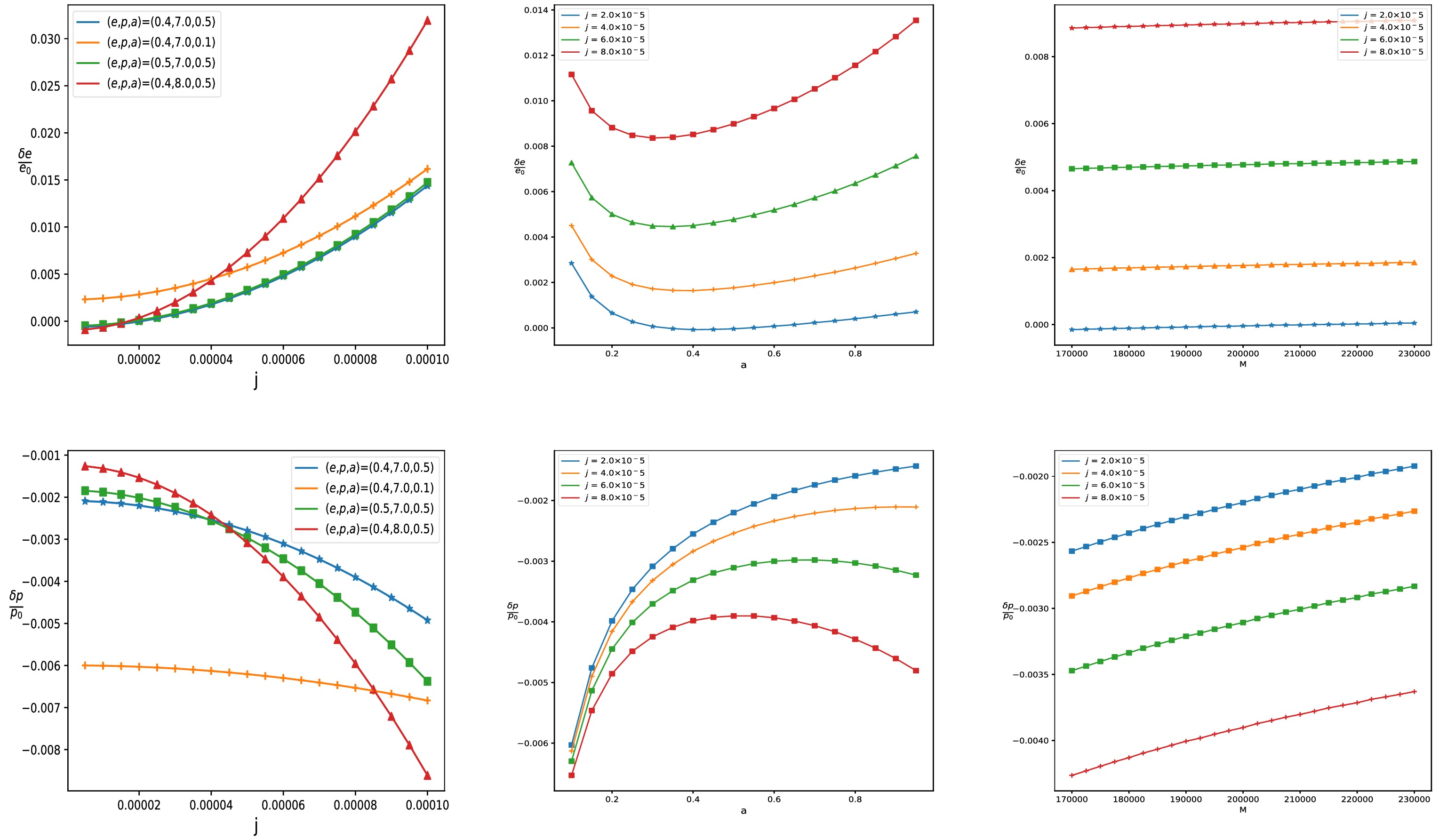 Here $ \delta p $ and $ \delta e $ are two small deviations of the orbital parameters. Solving above equations, we can obtain deviations $ \delta p $ and $ \delta e $ and further discuss confusion problem arising from orbital parameters e and p for fixed M, a and j. In Fig. 8, we present the relationship between the relative variations of orbital parameters and the black hole parameters j, a and M through matching the orbital frequency of Kerr and swirling-Kerr black holes. The results reveal that $ \delta e/e_0 $ increases rapidly and $ \delta p/p_0 $ decreases rapidly as j increases, which means that changes of the swirling parameter j must adjust the orbital parameters e and p to preserve consistent orbital frequencies. As the black hole spin parameter a increases, $ \delta e/e_0 $ first decreases and then increases, whereas the change in $ \delta p/p_0 $ is exactly the opposite of that. This means that effects of the background rotation parameter j on the relative variations $ \delta e/e_0 $ and $ \delta p/p_0 $ are distinctly different from those of the black hole spin parameter a. With the increase in the black hole mass M, both $ \delta e/e_0 $ and $ \delta p/p_0 $ increase, but $ \delta p/p_0 $ has a higher rate of change. Furthermore, we find that the change tendencies of $ \delta e/e_0 $ and $ \delta p/p_0 $ with the parameter j are similar to those observed with the MOG parameter α in the STVG[47], but the rates are different. Through above analysis, we find that the confusion problem also exists in the swirling-Kerr case.