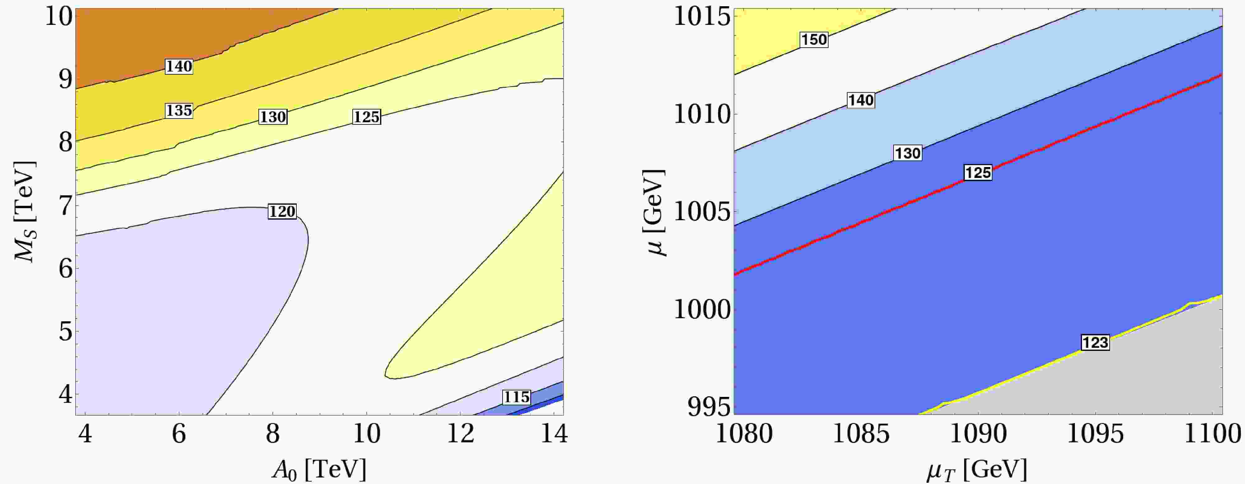 $ m_H $ in the$ A_0 $ -$ M_S $ parameter space, with$ \mu=1\; \mathrm {TeV} $ ,$ \mu_T=1.092\; \mathrm {TeV} $ , and$ B_{\mu_T}=5\left ( \mathrm {TeV}\right ) ^{2} $ . Right: Contour plot of the SM Higgs boson mass$ m_H $ in the$ \mu-\mu_T $ parameter space, with$ M_S=5.01\; \mathrm {TeV} $ ,$ A_0=12\; \mathrm {TeV} $ , and$ B_{\mu_T} =5\left ( \mathrm {TeV}\right ) ^{2} $ .The region in the right panel of Fig. 2 is in fact a zoomed-in view of the purple region in the right panel of Fig. 1. Although the triplet sector is nominally decoupled, the triplet parameter