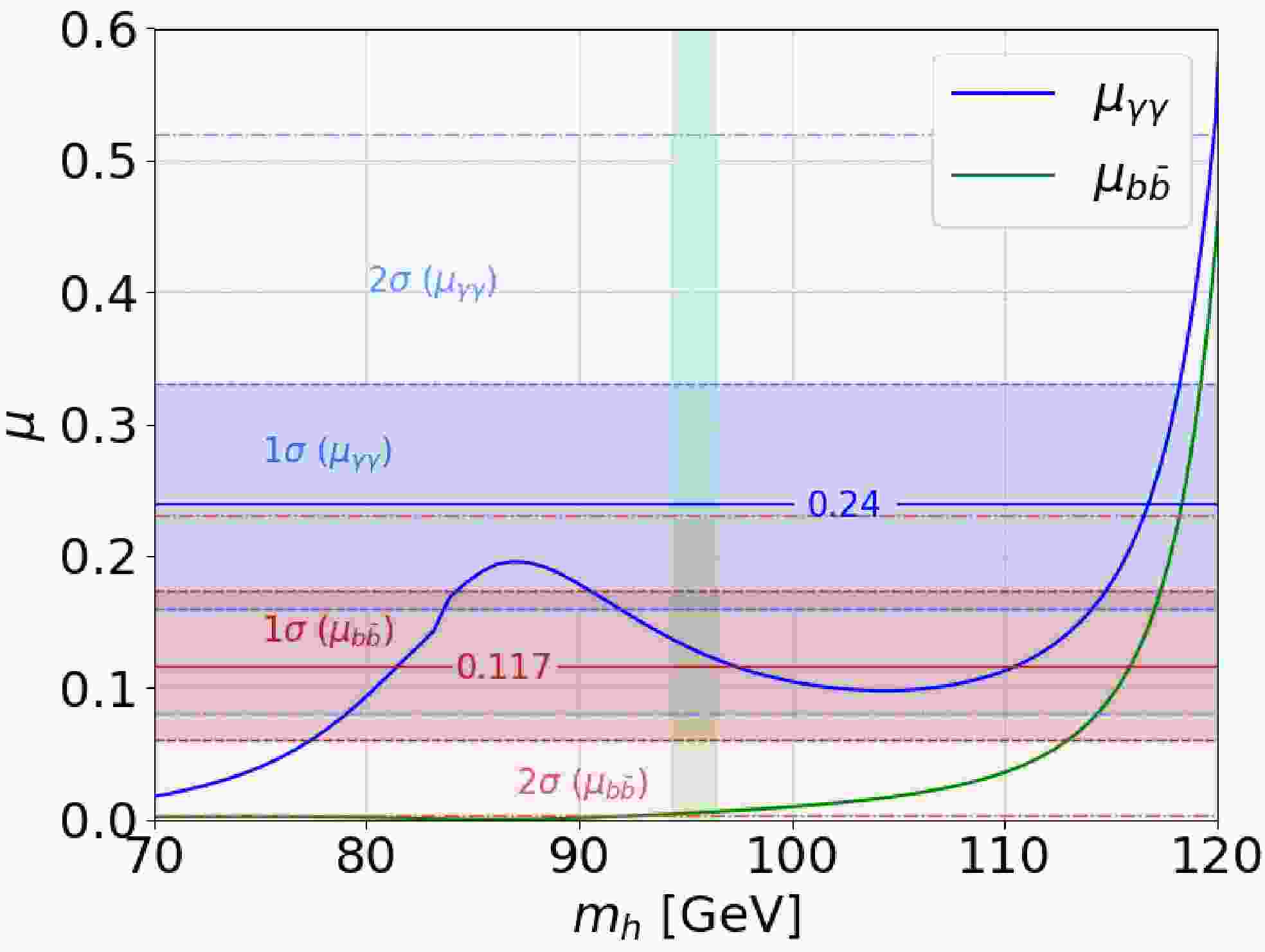 $ m_h=95.4 $ GeV and SM-like couplings. The observed signal strength of$ b\bar{b} $ near 95 GeV is consistent with zero (Fig. 3). The shaded blue band indicates the$ 1\sigma $ region for$ \mu_{\gamma\gamma} $ , while the light‐blue envelope shows its$ 2\sigma $ extension. Similarly, the dark‐red band represents the$ 1\sigma $ interval for the$ b\bar b $ channel, and the pale‐red shading corresponds to the$ 2\sigma $ bounds. The light-green strip highlights the mass window of$ m_h=95.4\pm 1\; {\rm{GeV}} $ . Given that the excess signals observed in the LEP, CMS, and ATLAS near 95 GeV are only valid within this specific range, the constraints on$ \mu_{\gamma\gamma} $ and$ \mu_{b\bar{b}} $ specifically refer to the mass window of$ m_h = 95.4 \pm 1\; {\rm{GeV}} $ . -