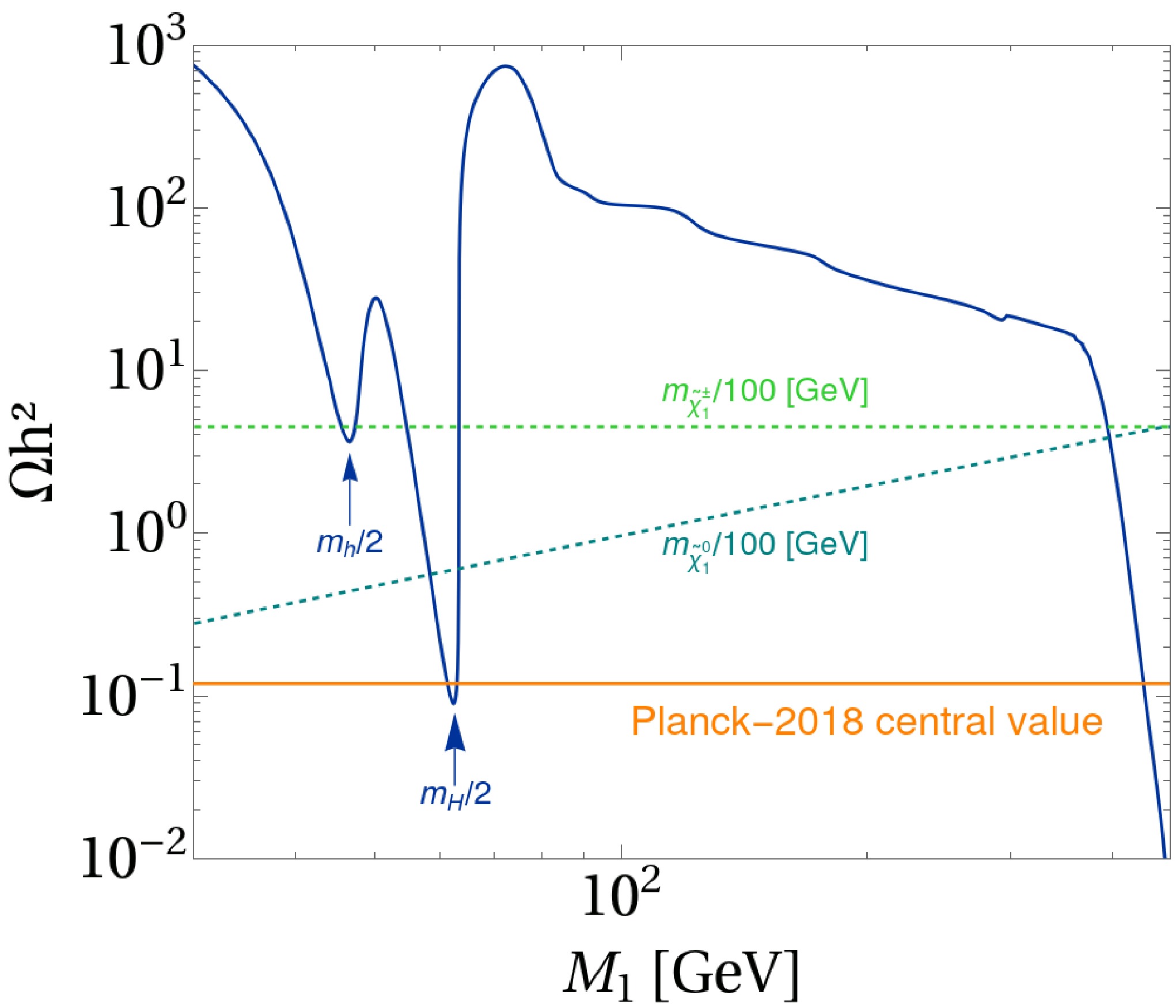 $ \Omega h^2 = 0.12 $ . The green dashed line shows the lightest neutralino mass, which increases linearly with$ M_1 $ , confirming its dominant bino composition. The bino relic density typically exceeds$ \Omega h^2 = 0.12 $ , but two resonant regimes—where$ 2m_{\tilde{B}} \approx m_h $ or$ 2m_{\tilde{B}} \approx m_H $ —enable resonant annihilation, sharply reducing the relic density. Additionally, when the cyan dashed line (chargino mass) nears the bino mass, co-annihilation processes further decrease the relic density.