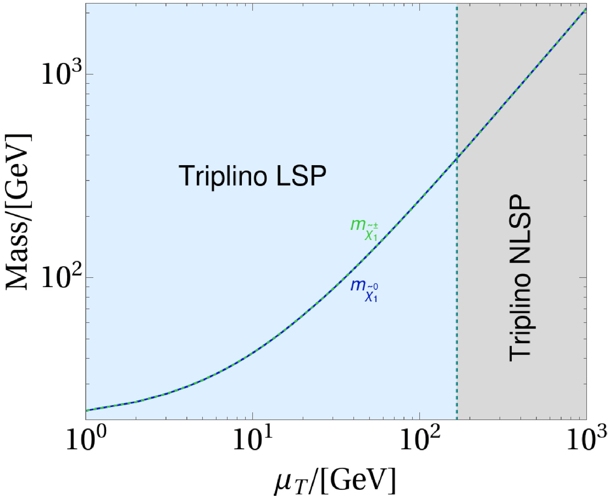 $ \mu_T = 50\; {\rm{GeV}} $ with$ \mu_T \ll M_1, M_2, \mu $ , ensuring the triplino is the LSP. However, the relic density is low, approximately$ 10^{-4} $ , due to strong$ {\rm{SU}}(2) $ interactions similar to those of the wino, which requires a mass of$ \sim 2\; {\rm{TeV}} $ to match the observed relic density. Although a heavy triplino LSP appears viable for dark matter, Fig. 5 shows that the triplino ceases to be the LSP above$ \sim 100\; {\rm{GeV}} $ . At tree level, with$ \mu \gg M_1, M_2 $ , the neutral and charged triplinos are nearly degenerate ($ m \approx 2\mu_T $ ) and dominate the LSP, as shown in Fig. 5. As$ \mu_T $ increases, loop corrections raise the neutral triplino’s mass more than the charged triplino’s, because the neutral triplino, a Majorana fermion, experiences larger Z-boson and scalar loop effects, while the charged triplino, a Dirac fermion, incurs smaller photon and W-boson corrections. This inverts the mass hierarchy, making the charged triplino the LSP. Consequently, we adopt a bino LSP for this study.