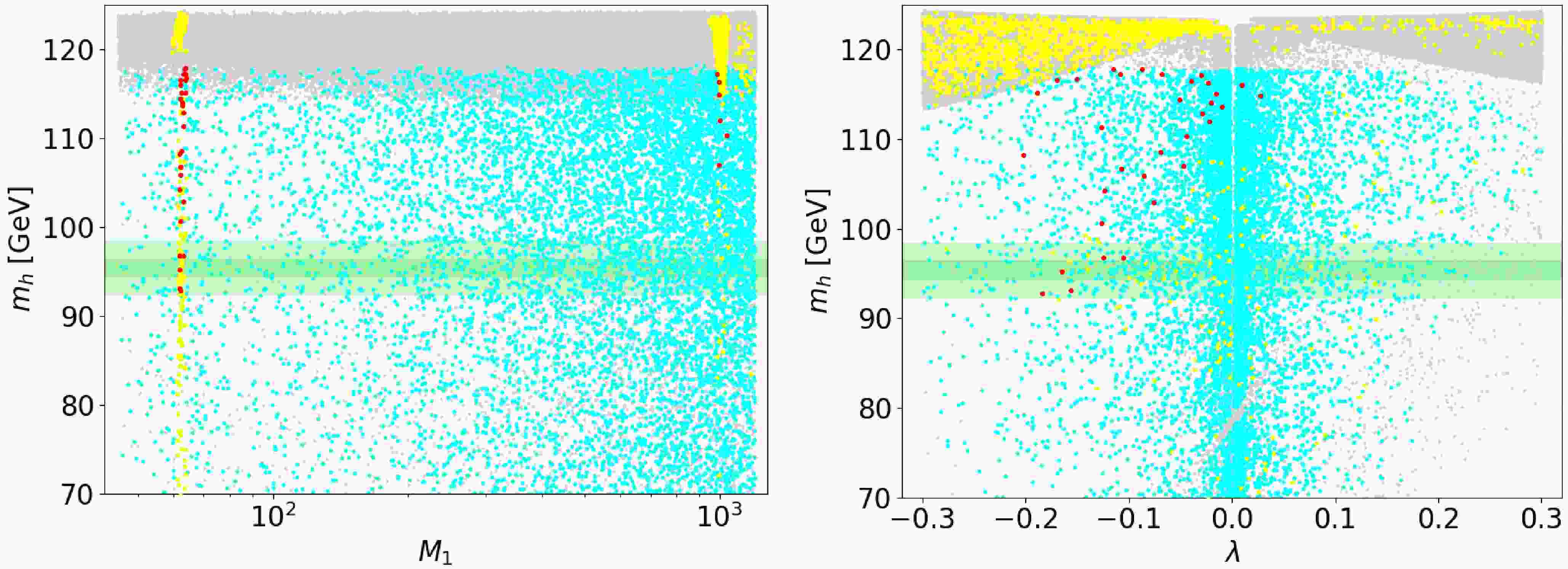 $ m_h $ and$ M_1 $ , while the right panel presents the correlation between$ m_h $ and λ. The color scheme follows the description in the color conditions and the surrounding context. The green band indicates that$ m_h=95.4\pm 1\; \mathrm {GeV} $ , the light green area represents$ m_h=95.4\pm 3\; \mathrm {GeV} $ .In the right panel of Fig.6, the quartic coupling λ exhibits a