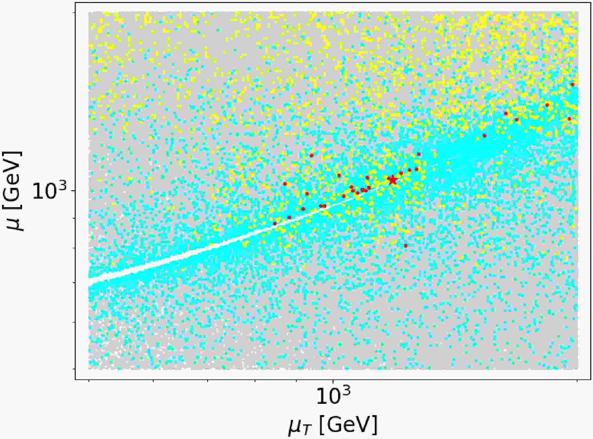 $ \mu-\mu_T $ plane. The parameter points follow the color scheme described in the text. Red star markers represent parameter sets satisfying all red point conditions plus the Higgs mass constraint$ m_h = 95.4 \pm 1\; {\rm{GeV}} $ . -