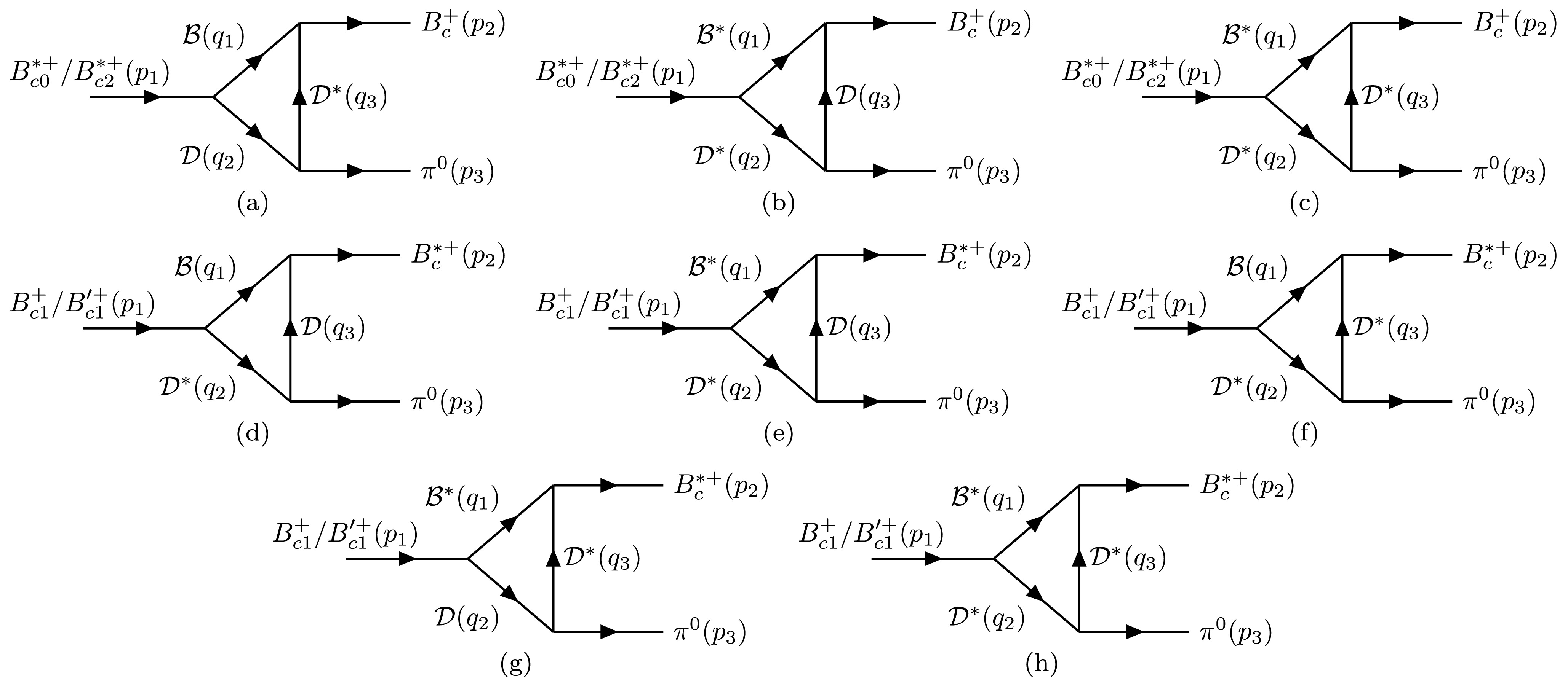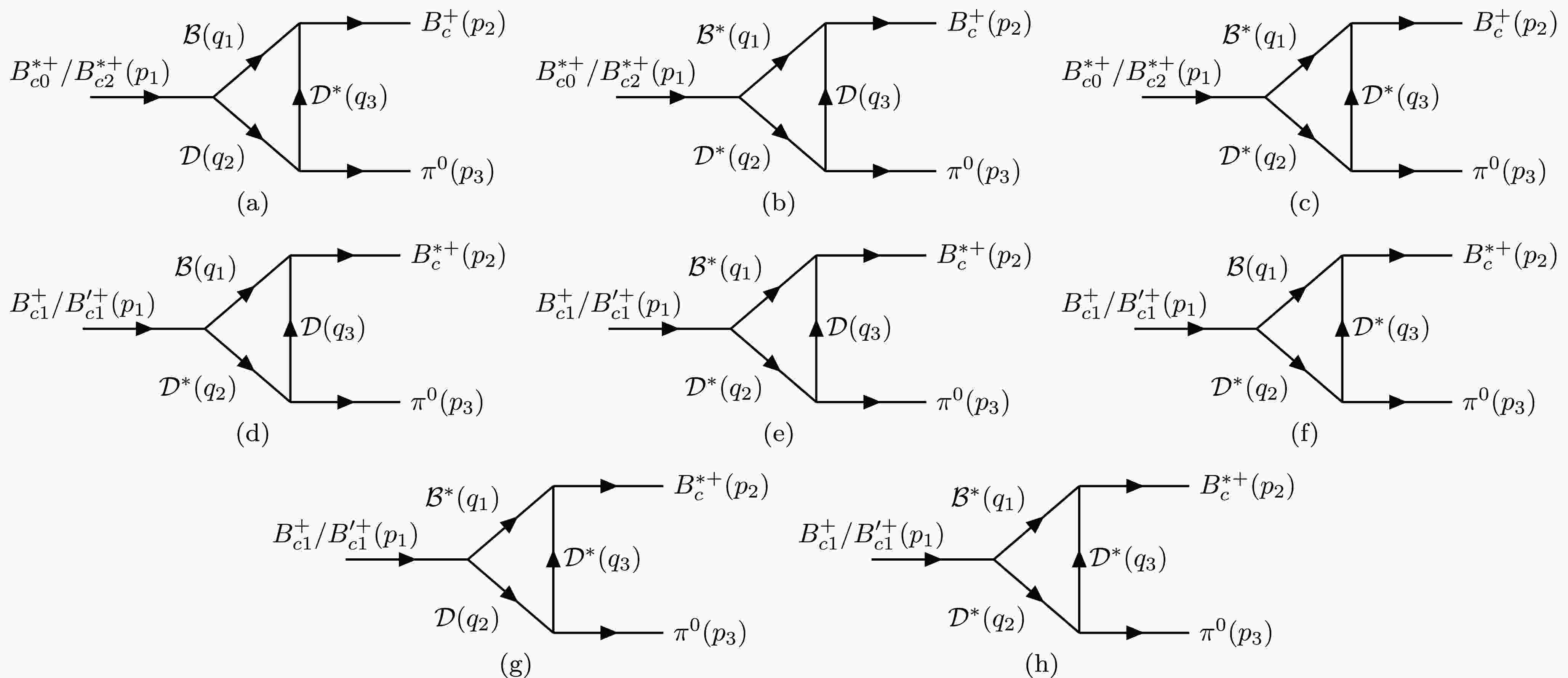 $ B_{c}(1P)^{+}\to B_{c}^{(*)+}\pi^{0} $ via intermediate meson loops without$ \eta-\pi^{0} $ mixing, where$ \mathcal{B}=(B^{+},B^{0}) $ and$ \mathcal{D}=(D^{0},D^{+}) $ . (a)–(h) illustrate different intermediate meson loops.$ \begin{aligned} i \mathcal{M}_{0}(\mathcal{B},\mathcal{D},\mathcal{D}^{*})= \int \frac{d^{4}q_{3}}{(2\pi)^{4}} \dfrac{g_{B^{*}_{c0}\mathcal{B}\mathcal{D}}g_{B_{c}\mathcal{B}\mathcal{D}^{*}}g_{\mathcal{D}^{*}\mathcal{D}\mathcal{P}}q_{1}^{\mu}\left(g_{\mu\nu}-\dfrac{q_{3\mu}q_{3\nu}}{m^{2}_{3}}\right)p_{3}^{\nu}}{(q_1^{2}-m_1^{2})(q_2^{2}-m_2^{2})(q_3^{2}-m_3^{2})}\mathcal{F}(q_{i}^{2})\,, \end{aligned} $