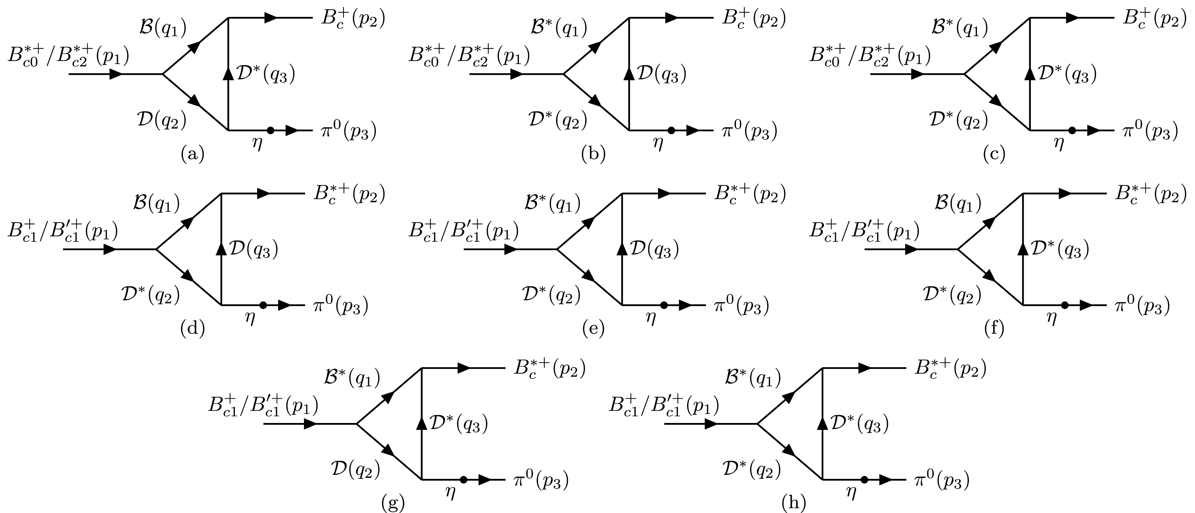 $ \eta-\pi^{0} $ mixing corresponding to Fig. 1, we denote the amplitude as$ i\mathcal{M}_k(P_1,P_2,P_3) $ , where$ k=0,2,1 $ and$ 1^{\prime} $ corresponds to$ B_{c0}^{*+},B_{c2}^{*+},B_{c1}^{+} $ and$ B_{c1}^{\prime+} $ , respectively. Here,$ P_i $ represents the intermediate meson with momentum$ q_i $ and$ B_{\mu\nu} $ denotes the polarization tensor of the initial$ B_{c2}^{*+} $ .$ \varepsilon^{i}_{\mu} $ denotes the polarization vector of the initial$ B_{c1}^{(\prime)+} $ and$ \varepsilon^{f}_{\mu} $ denotes the polarization vector of the final$ B_{c}^{*+} $ . The amplitudes corresponding to Fig. 1 can thus be expressed as