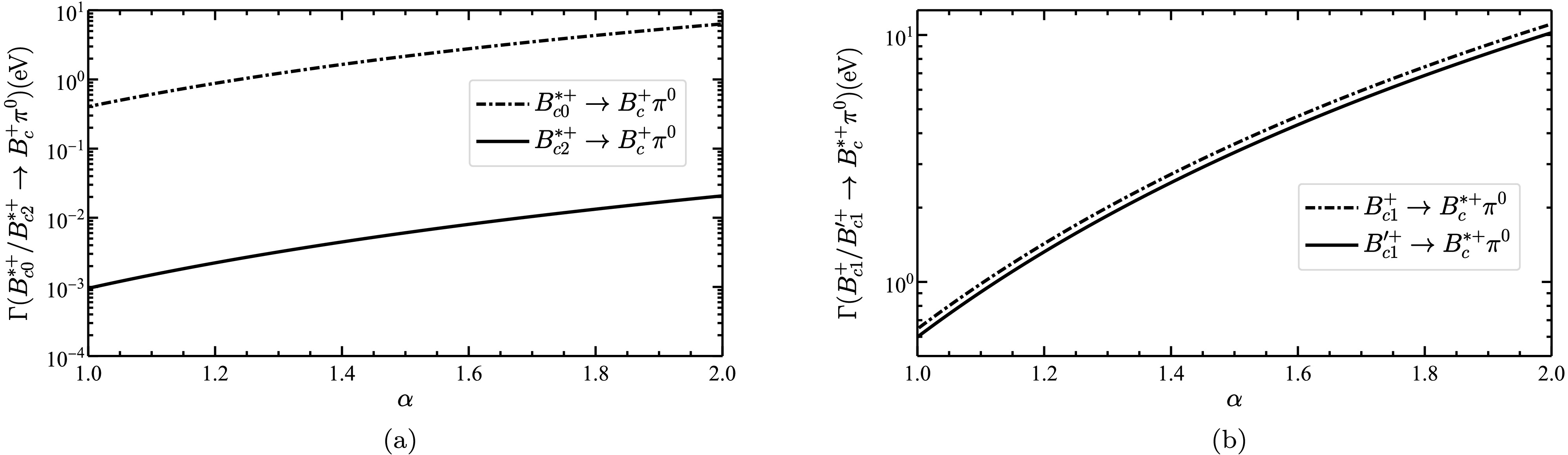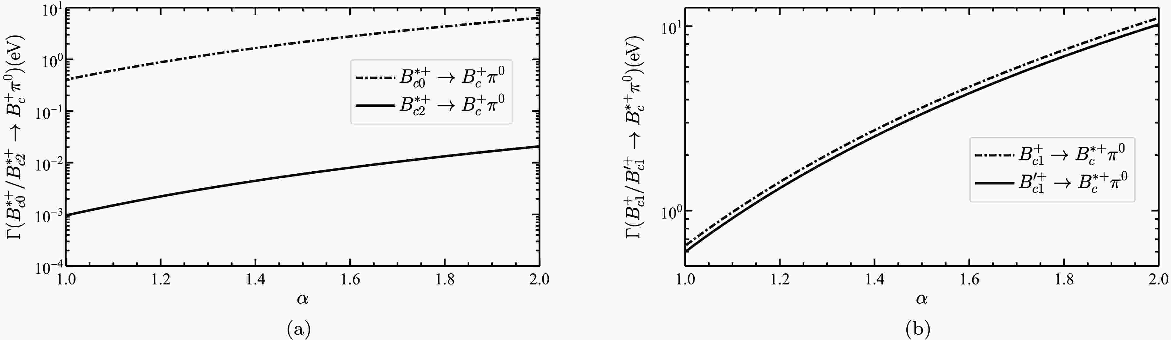 $ B_{c}(1P)^{+}\to B_{c}^{(*)+}\pi^{0} $ with$ \alpha=1.0 $ ,$ 1.35 $ ,$ 1.5 $ ,$ 1.65 $ and$ 2.0 $ in unit of eV.Decay channel $ B_{c0}^{*+}\to B_{c}^{+}\pi^{0} $