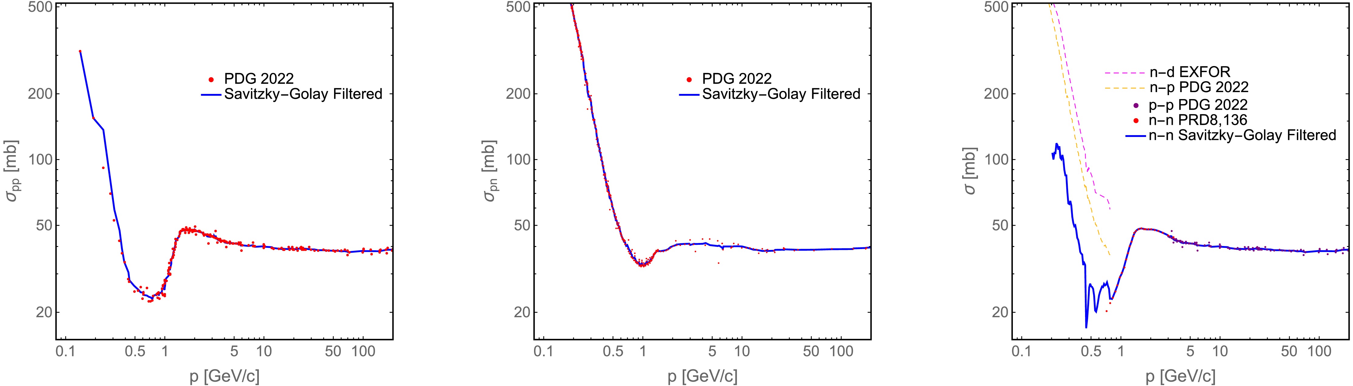 Figure 1. (color online) Left: Proton-proton total cross section from the 2022 PDG compilation (red points; averaged when multiple measurements exist at the same beam momentum) together with the Savitzky-Golay smoothed curve (blue) adopted in this work. Middle: Same for the proton-neutron total cross section. Right: Neutron-neutron total cross section (blue curve) obtained from a Savitzky-Golay fit to three data sets: low-momentum points (orange dashed) extracted as