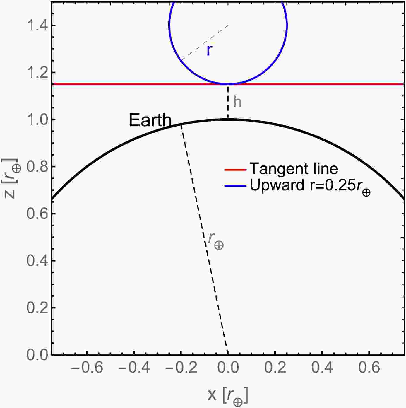 $ r=\mathfrak{R}/B $ , almost independent of the remainder of the orbit. We therefore replace the tangent line by an upward-bending circular arc of radius r that reaches the same perigee altitude h (blue curve in Fig. 3). Downward-bending geometries with$ r>r_{\oplus}+h $ can also yield perigee h, but are not considered here. The limit$ r\to\infty $ recovers the straight-line case. The parameterized integrated trajectory is indeed a circle with radius r, while we have checked that the arc around the perigee almost contributes the whole integration. For simplicity the arc is taken to lie in the plane containing the Earth's centre and the perigee point.Figure 5 compares the numerical integration of