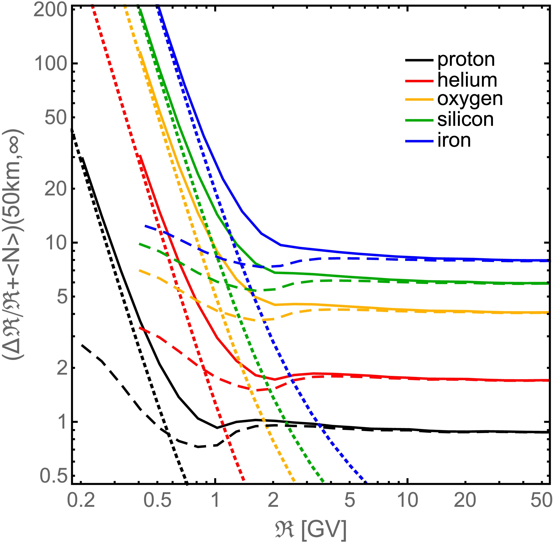$ \Delta\mathfrak{R}/\mathfrak{R}+\langle N\rangle $ versus rigidity for five cosmic-ray species on a straight-line trajectory tangent to the atmosphere at$ h=50 $ km. Bethe-Bloch energy loss, scaling approximately as$ \beta^{-2} $ , dominates at low rigidities, while hard scattering, with its nearly energy-independent cross section, takes over at high rigidities. The crossover occurs at$ \sim0.57 $ GV for protons and rises to$ \sim1.4 $ GV for iron. These reference values are inserted into Eq. 13 to obtain the full altitude- and curvature-corrected estimates. Again, values$ \Delta\mathfrak{R}/\mathfrak{R}\gtrsim1 $ obtained from the perturbative calculation are simply rescaled by Eq. 13 to the region$ \Delta\mathfrak{R}/\mathfrak{R}\ll1 $ .