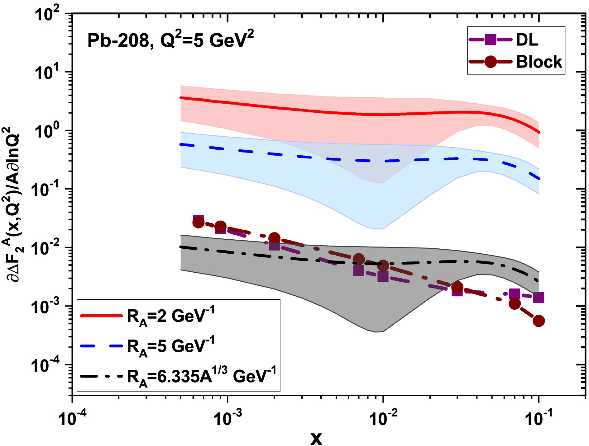$ \frac{1}{A}\frac{\partial}{\partial{\ln}Q^2}{\Delta}F_{2}^{A}(x,Q^2) $ for the heavy nucleus of Pb-208 are shown as a function of the momentum fraction x at$ Q^2=5\; {\rm{GeV}}^2 $ at$ {\cal{R}}_{A}=1.25A^{1/3}\; {\rm{fm}} $ . These results are determined by the DL (square-purple) [32] and Block et al (circle-brown) [33, 34] gluon distributions and compared with the nCETQ15 parameterization [45] results at$ {\cal{R}}_{A}=2\; {\rm{GeV}}^{-1} $ (solid curve-red),$ {\cal{R}}_{A}=5\; {\rm{GeV}}^{-1} $ (dashed curve- blue) and$ {\cal{R}}_{A}=6.335A^{1/3}\; {\rm{GeV}}^{-1} $ (dashed- dot curve- black) with uncertainties.