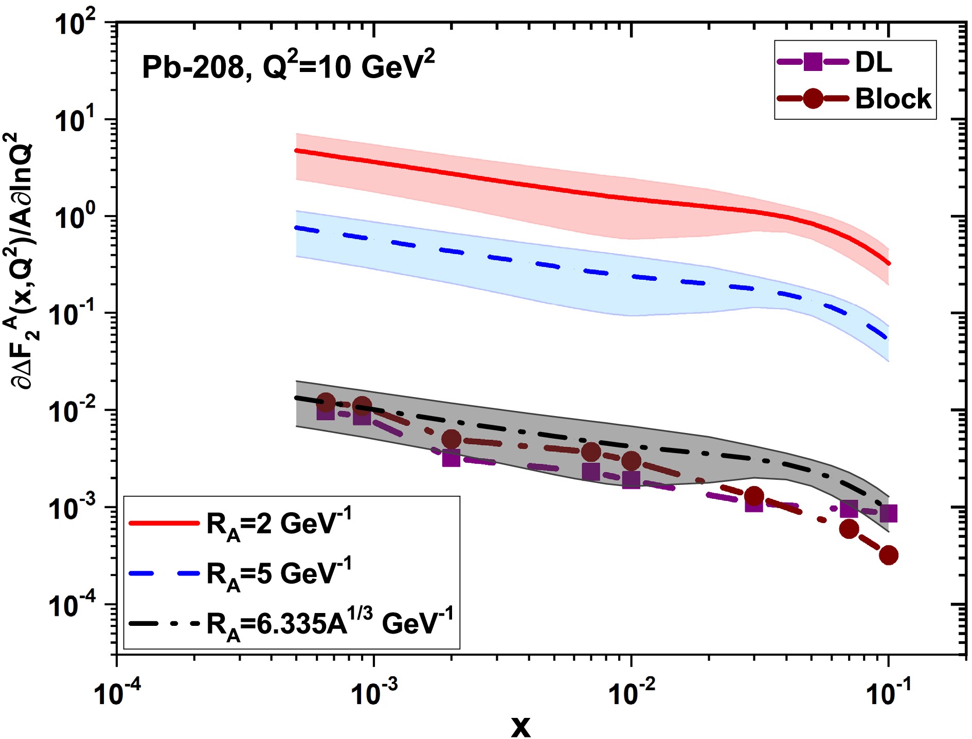 $ \frac{1}{A}\frac{\partial}{\partial{\ln}Q^2}{\Delta}F_{2}^{A}(x,Q^2) $ , which quantifies the effect of non-linear corrections. In Fig.1, the non-linear corrections to$ \frac{1}{A}\frac{\partial}{\partial{\ln}Q^2}{\Delta}F_{2}^{A}(x,Q^2) $ for the heavy nucleus of Pb-208 are plotted as a function of the momentum fraction x at$ Q^2=5\; {\rm{GeV}}^2 $ and$ {\cal{R}}_{A}=1.25A^{1/3}\; {\rm{fm}} $ (or$ {\cal{R}}_{A}=6.335A^{1/3}\; {\rm{GeV}}^{-1} $ )). The results are determined with respect to the DL (square-purple) [32] and Block et al (circle-brown) [33, 34] methods. They are also compared to the nCTEQ15 parameterization with uncertainties at corresponding values of$ Q^2 $ represented by the solid curve (red,$ {\cal{R}}_{A}=2\; {\rm{GeV}}^{-1} $ ), the dashed curve (blue,$ {\cal{R}}_{A}=5\; {\rm{GeV}}^{-1} $ ) and the dashed-dot curve (black,$ {\cal{R}}_{A}=1.25A^{1/3}\; {\rm{fm}} $ . These results are comparable to the nCTEQ15 parameterization at$ {\cal{R}}_{A}=1.25A^{1/3}\; {\rm{fm}} $ . The nCTEQ15 parameterization results in a wide range of x are flat, while our results increase as x decreases. This difference is due to the behavior of the DL and Block et al gluon distribution functions. With an increase in$ Q^2 $ values, the nCTEQ15 parameterization results increase as x decreases. In Fig.2, we show this behavior for the heavy nucleus of Pb-208 at$ Q^2=10\; {\rm{GeV}}^2 $ . Our results are comparable to the nCTEQ15 parameterization results accompanied by uncertainties at small x values. The difference between the results with the nCTEQ15 parameterization results at$ {\cal{R}}_{A}=1.25A^{1/3}\; {\rm{fm}} $ at moderate x values is due to the gluon dominance solely in our results. In Figs.1 and 2, we observe that the non-linear corrections to the derivative of the nuclear structure function (i.e., Eq.(16)) decrease with increasing correlation radius$ {\cal{R}}_{A} $ of the gluon hot spots (Indeed, the non-linear terms in the GLR-MQ equations are suppressed as$ 1/{\cal{R}}^{2}_{A} $ ). The x and$ Q^2 $ dependence in these figures (i.e., Figs.1 and 2) is also influenced by the behavior of the gluon distribution function in Eq.(16). As expected, the recombination of low-x gluons can be seen as a consequence of gluon-gluon recombination in Eq.(16) as$ [xg(x,Q^2)]^2 $ .In the following, we present the non-linear corrections to the derivative of the nuclear reduced cross section into