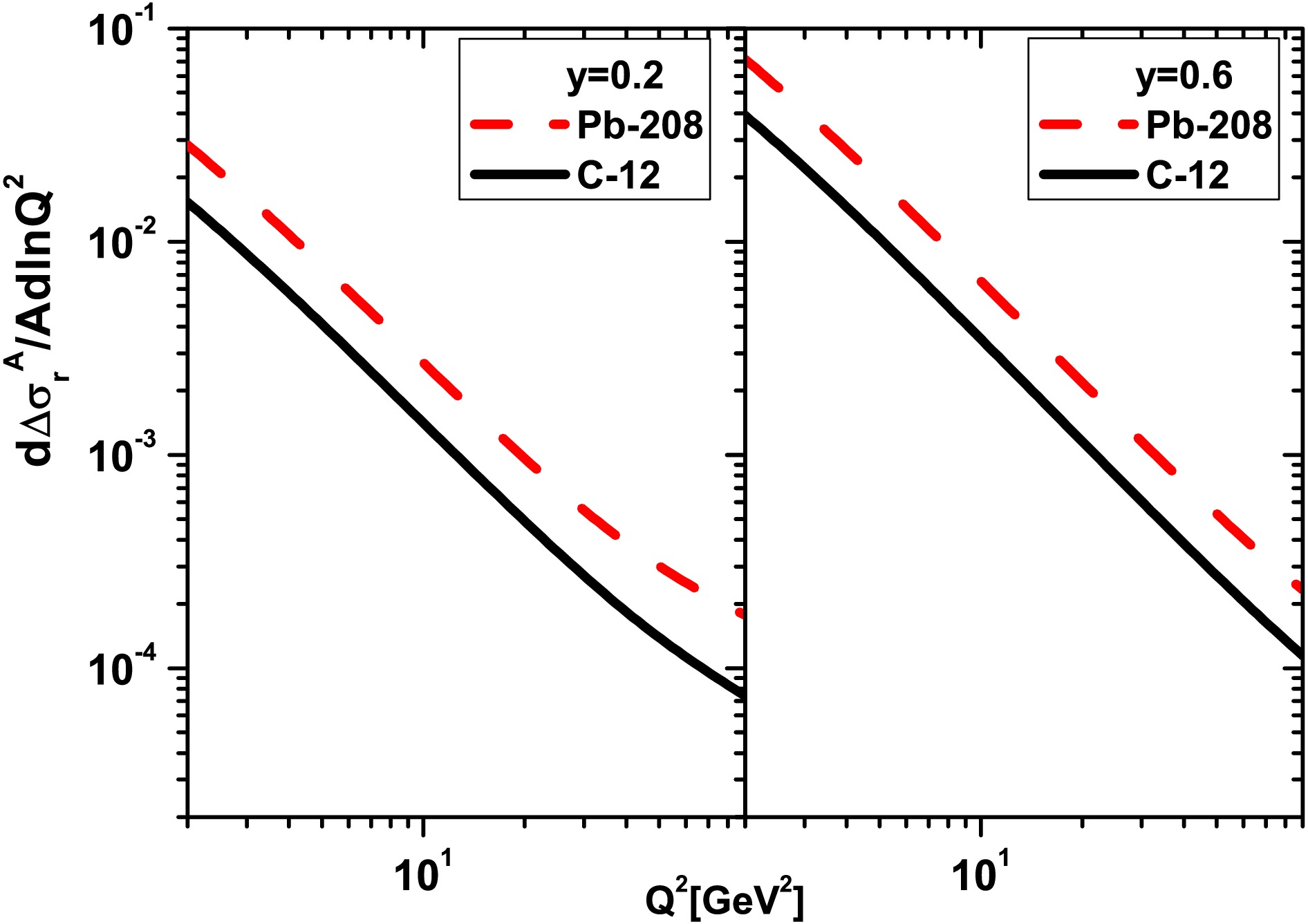 $ \frac{1}{A}\frac{{\partial}}{{\partial}{\ln}Q^2}\Delta\sigma_{r}^A(x,Q^2) $ are shown as a function of$ Q^2 $ at$ y=0.2 $ (left) and$ y=0.6 $ (right) for the light nucleus of C-12 (black-solid curve) and the heavy nucleus of Pb-208 (red-dashed curve) due to the DL method [32].