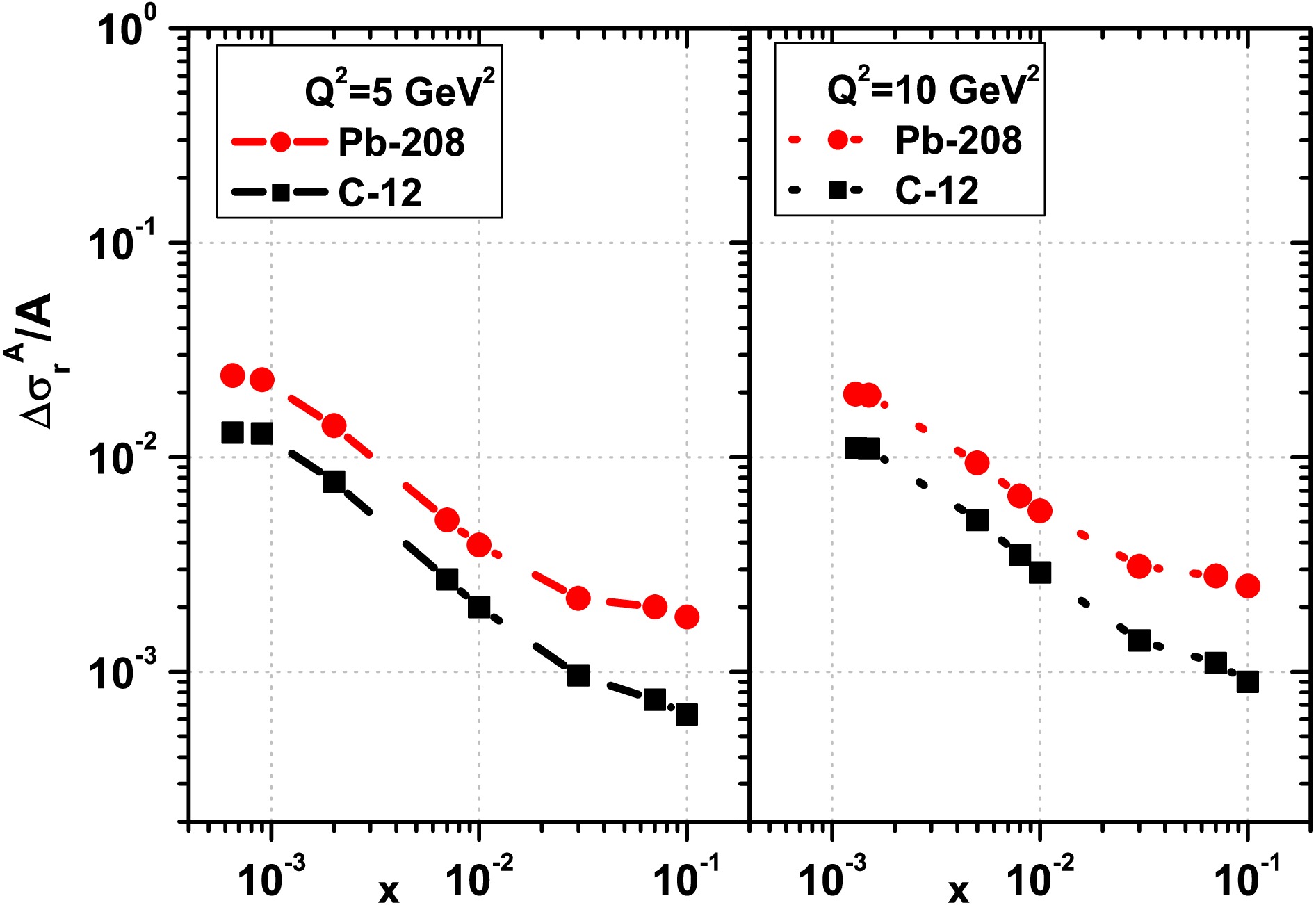 $ \frac{{\partial}{\Delta}\sigma_{r}^{A}(x,Q^2)}{A{\partial}{\Delta}\sigma_{r}(x,Q^2)}|_{y=cte}{\simeq} \frac{\partial{\Delta}F_{2}^{A}(x,Q^2)}{A\partial{\Delta}F_{2}(x,Q^2)}= $ $ A(R_{g}^{A})^2\frac{{\pi}{\cal{R}}^{2}_{p}}{{\pi}{\cal{R}}_{A}^2} $ as a function of Bjorken-x for the light nucleus of C-12 (green curves) and the heavy nucleus Pb-208 (blue curves) with$ {\pi}{\cal{R}}^{2}_{p}=1.55{\pm}0.02\; {\rm{fm}}^2 $ and$ {\cal{R}}_{A}=1.12A^{1/3}- $ $ 0.86A^{-1/3}\; {\rm{fm}} $ .$ R_{g}^{A} $ is predicted by the HIJING parameterization.For comparison with the nCTEQ15 nPDFs [45] results, we calculate the expression