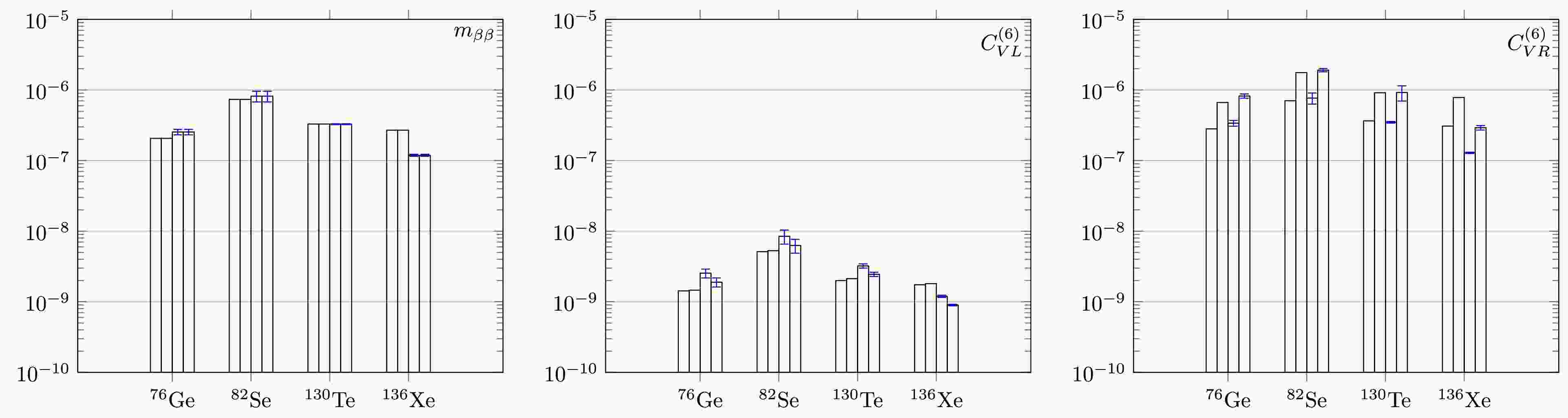 $ \begin{aligned} \alpha_{L,R}\equiv Re\left[\frac{m_{\beta\beta}}{m_e}\left(\frac{C_{VL,VR}^{(6)}}{2V_{ud}}\right)^*\right],\quad\tilde{C}^{(6)}_{VL,VR}=\frac{C^{(6)}_{VL,VR}}{2V_{ud}}. \end{aligned} $