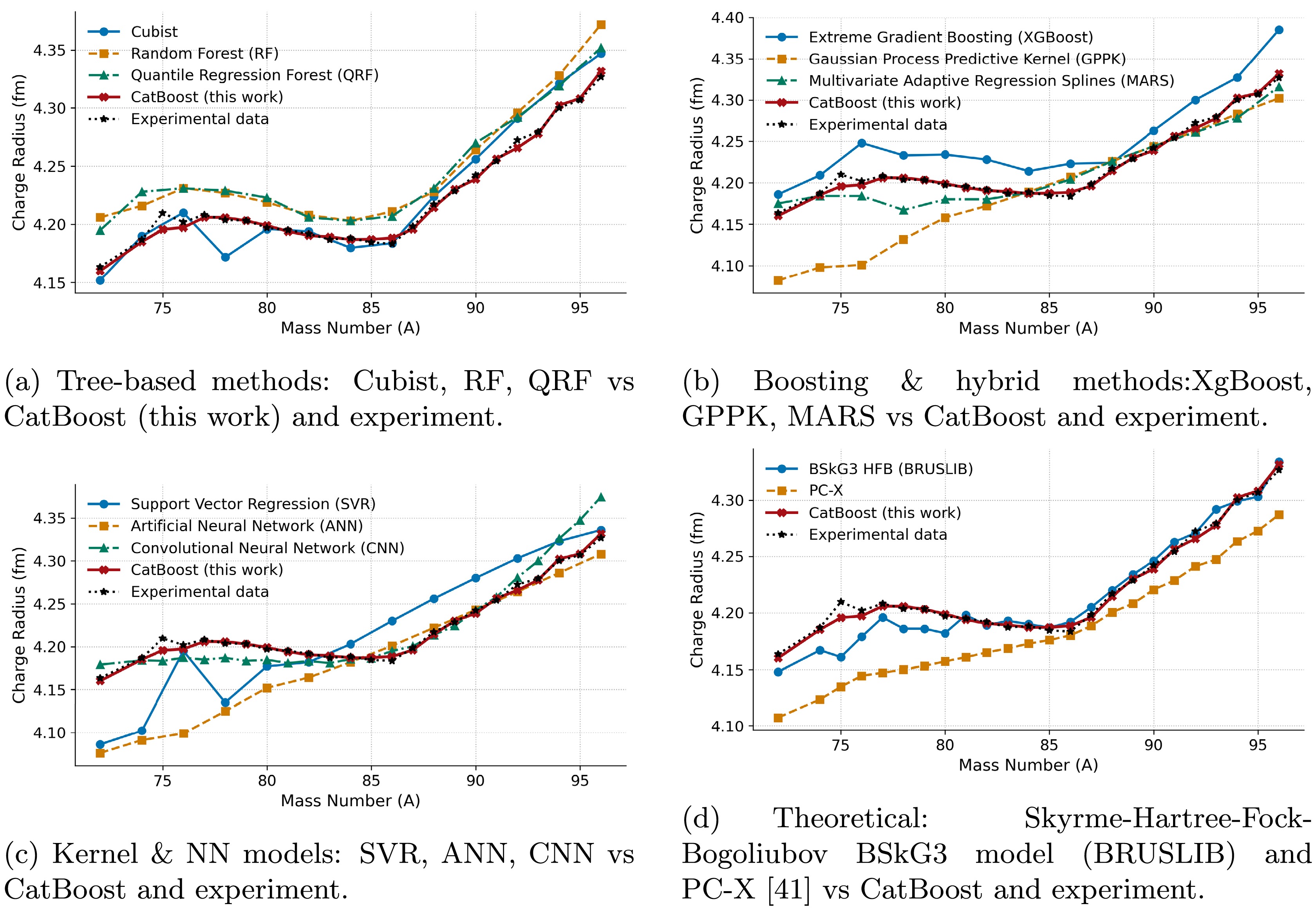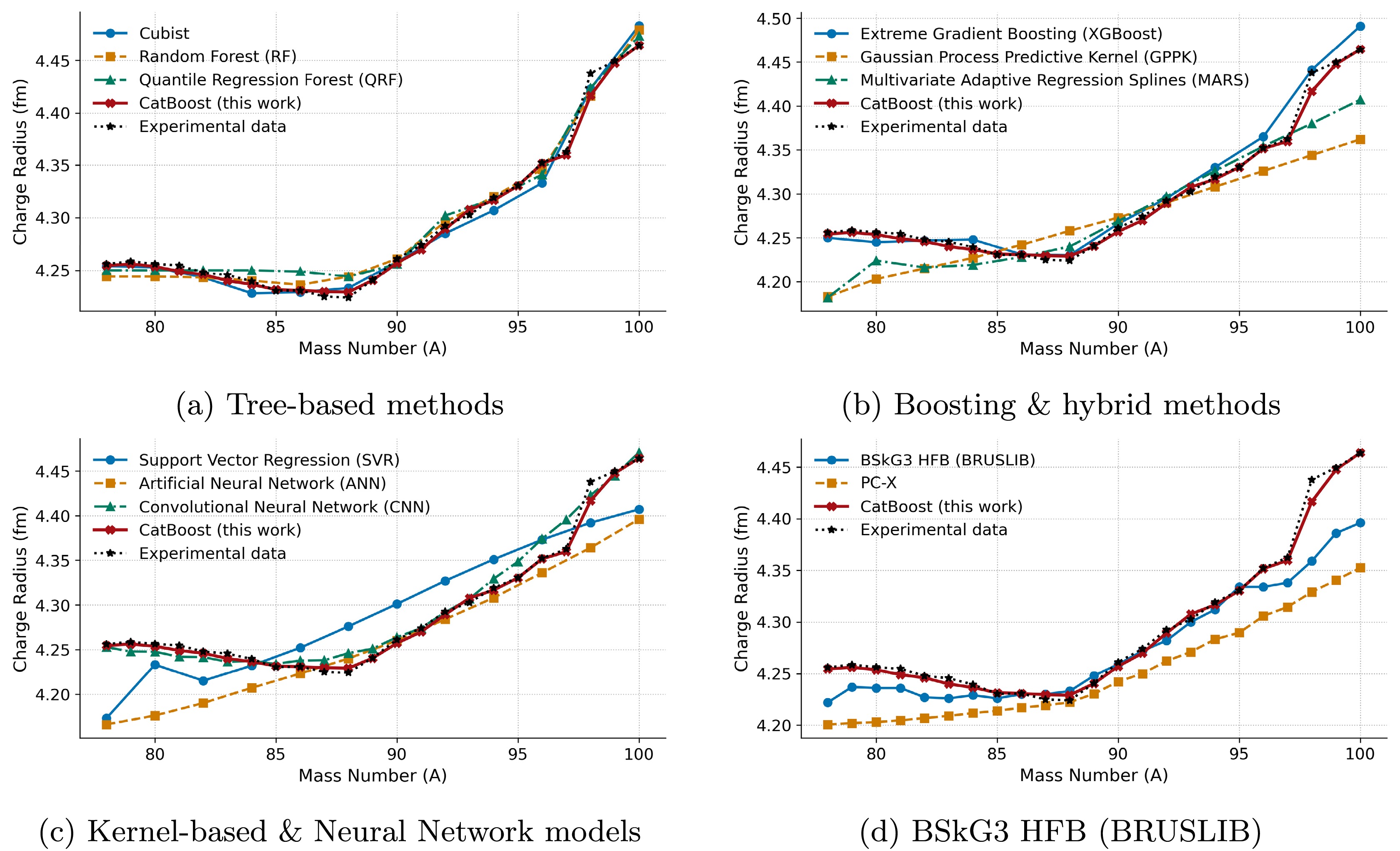 $ A = 78-100 $ ), classical tree models (Cubist, RF, QRF) show a relatively good fit with shell-closure kink but also come with localized deviations at multiple points larger than Catboost's predictions. XGBoost follows the overall trend, captures the kink at shell closure, but yet overestimates beyond A = 96, therefore having lesser predictive performance than CatBoost. GPPK and MARS underestimate at both the light- and heavy-mass ends and produce overly smooth, too-flat profiles that diverge from experimental values. SVR also demonstrates a too-flat line, misses the N = 50 kink and overall trend pattern, while ANN underestimates both heavy-mass and light-mass end radii and only fits relatively well in the mid-range (A = 86 to 97). Among all approaches (except CatBoost), CNN exhibits the closest fit but still deviates from A=95 to 97. The BSkG3 model reproduces the kink and accurate charge radii between A=85 and 95 but underestimates radii below A = 80.