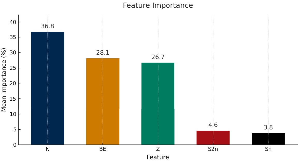$ A = N + Z $ ), and would provide no independent information, and our preliminary tests showed no improvement in predictive performance. Its exclusion thus can enhance the model stability and preserve the clarity for SHAP-based feature importance analysis. However, as detailed in Section 3.2, Sn and S2n were subsequently removed from the feature set for the final model. -